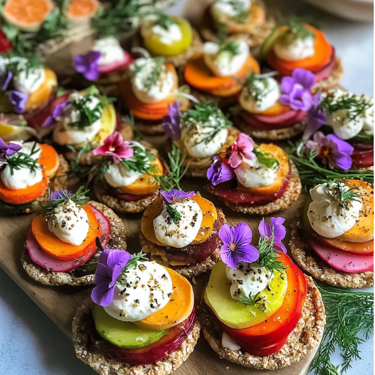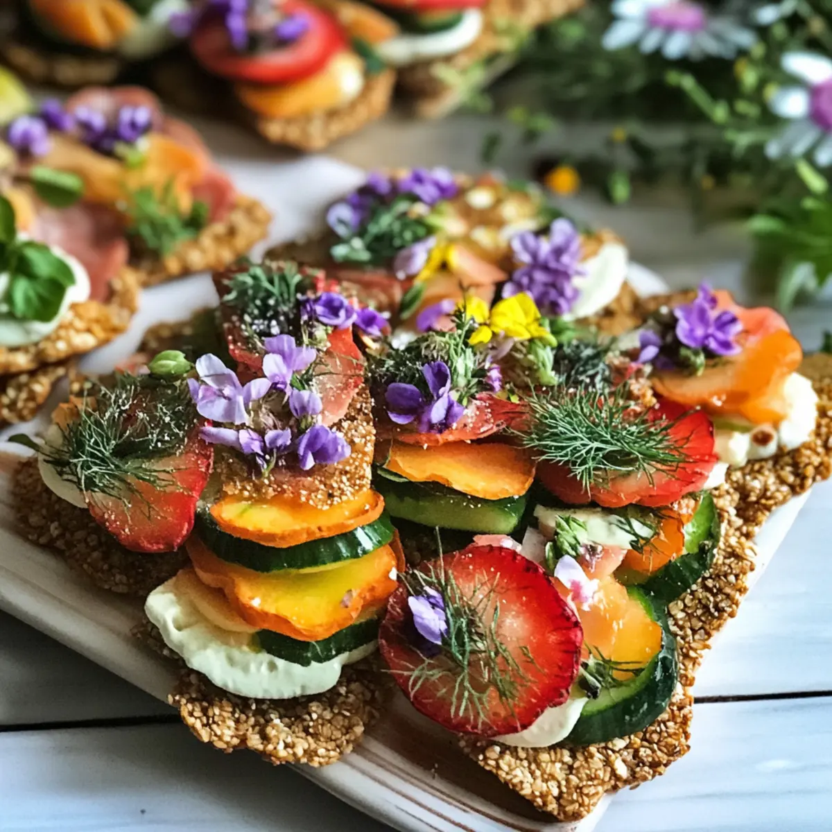 - Lege die bunten Gemüse auf die Vollkorncracker oder Brotscheiben und belege sie großzügig mit dem vorbereiteten Dip.