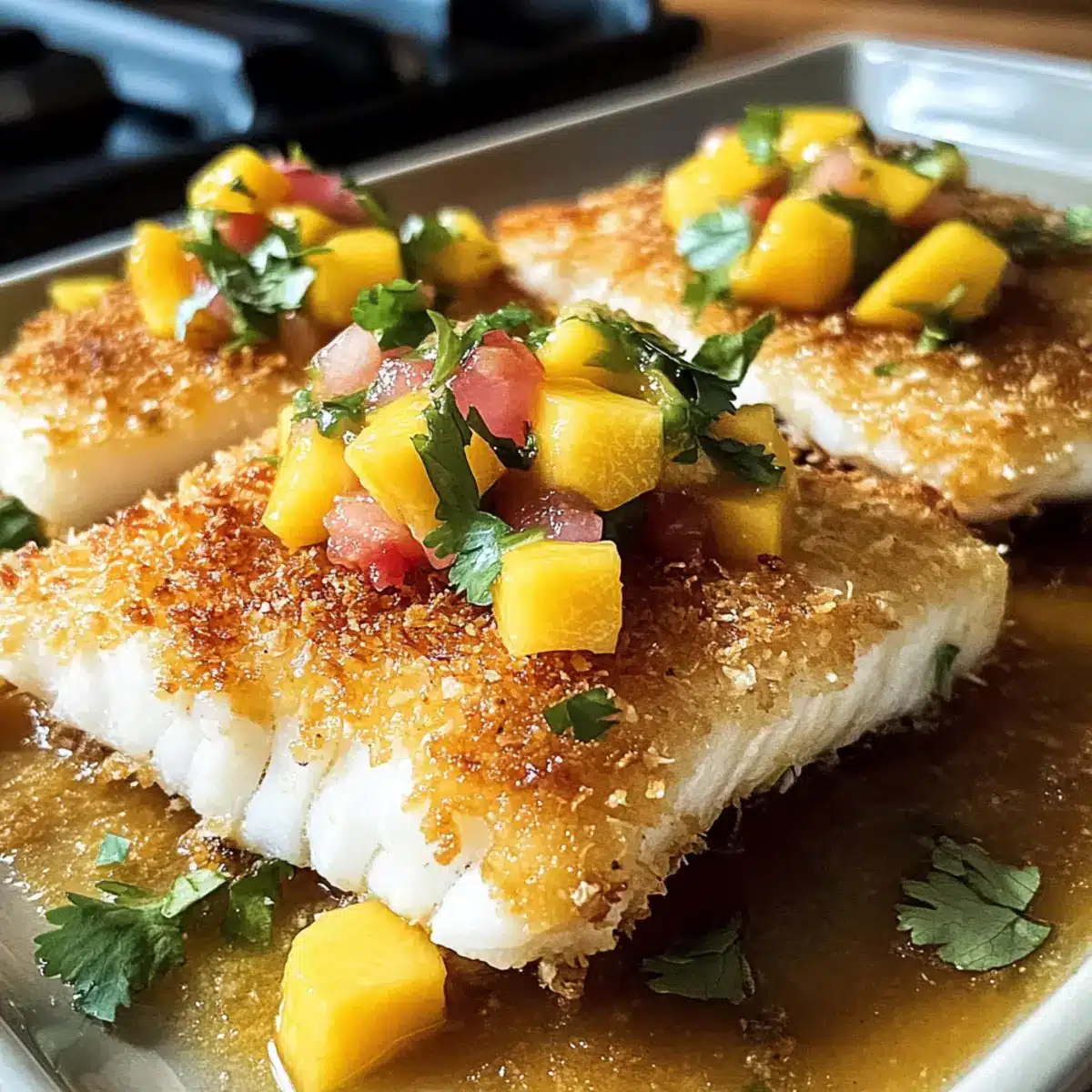 Tropischer Kokosnuss-panierter Fisch mit Mango-Salsa
