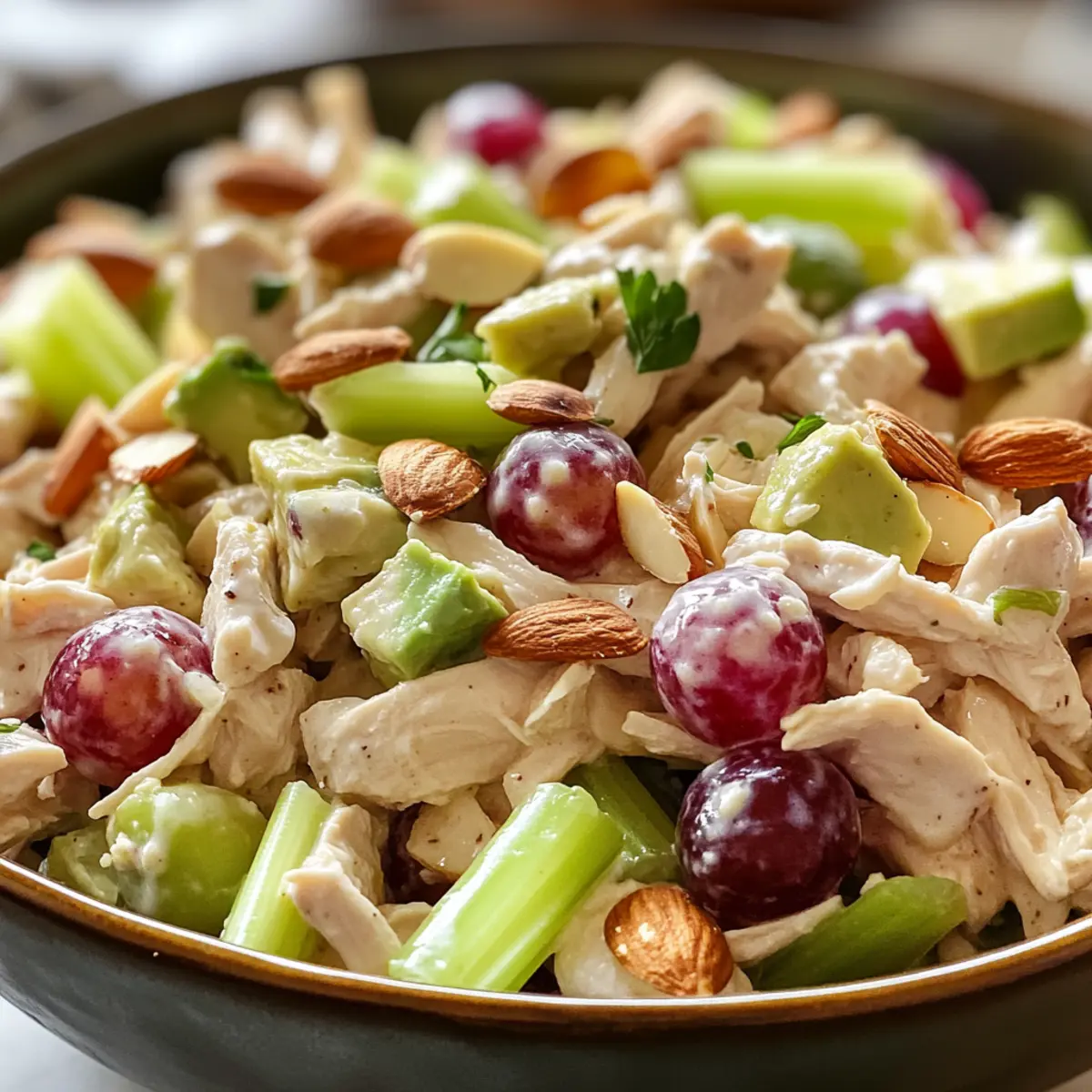 - Vermische das Hühnchen, Sellerie, Zwiebel, Trauben, Petersilie und Mandeln in einer großen Schüssel.