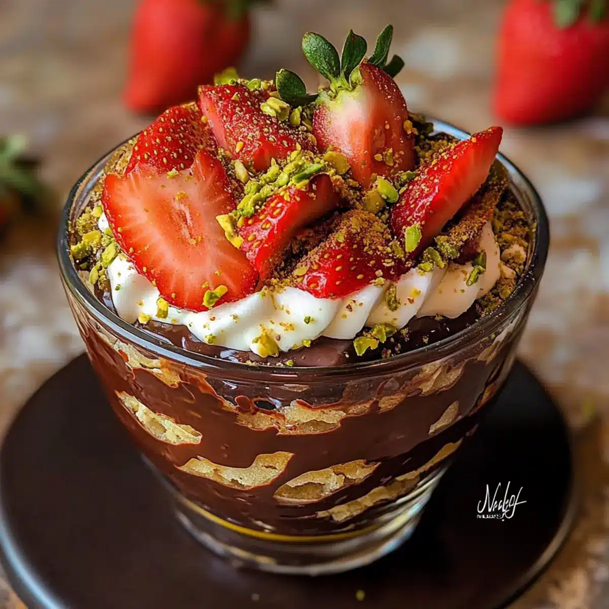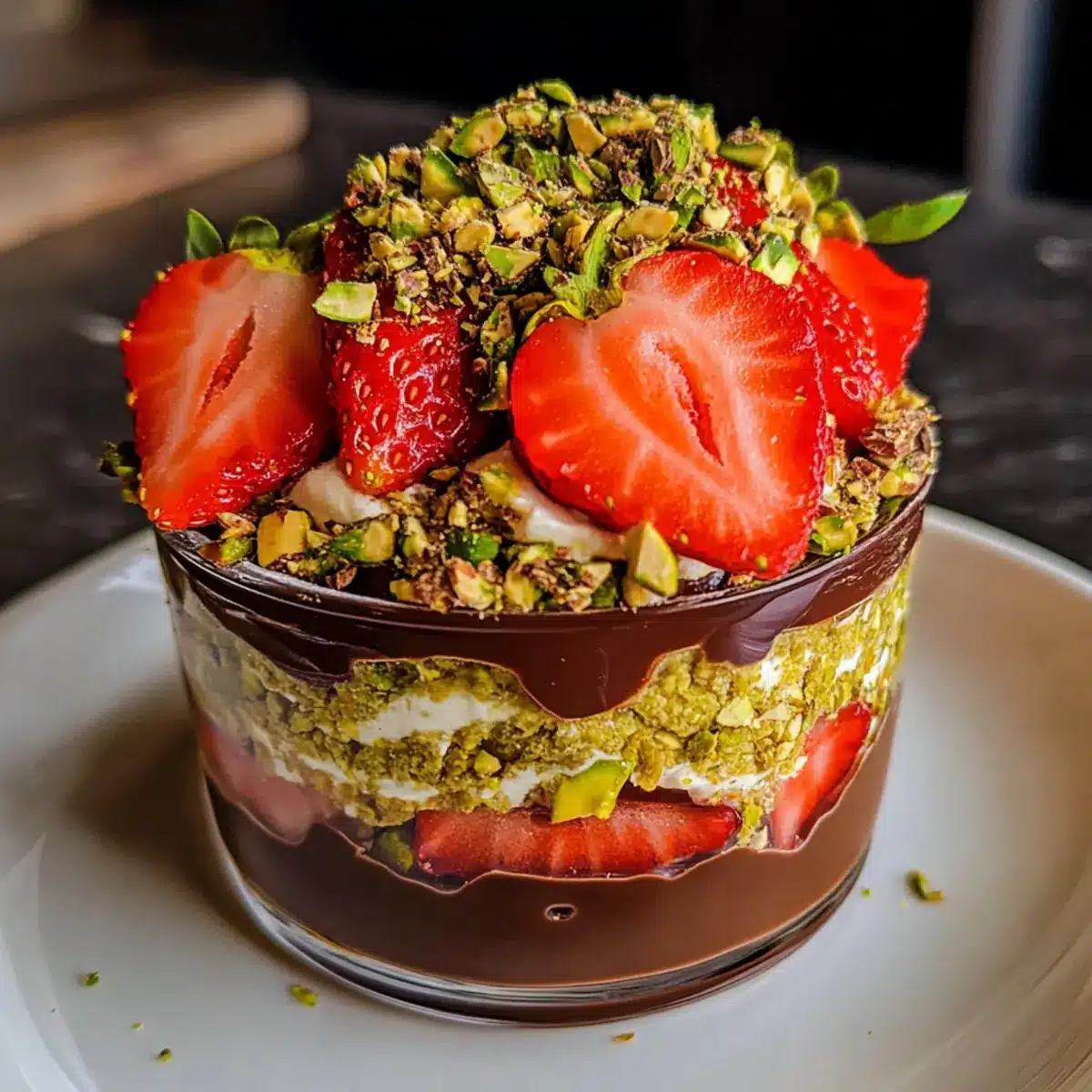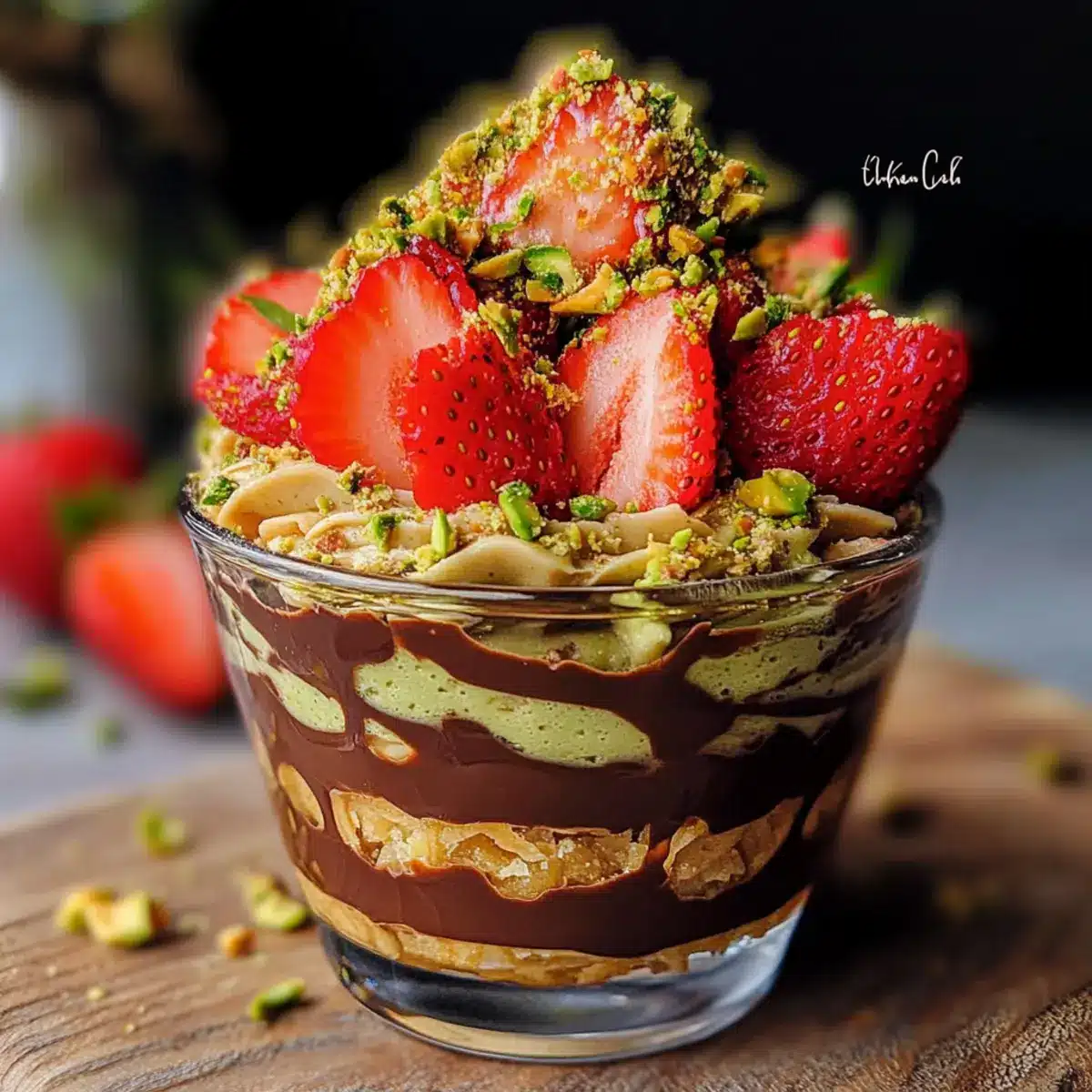 Beginne mit dem Schichten der Zutaten in Serviergläsern. Beginne mit einer Schicht Erdbeeren, gefolgt von der Kataifi-Pistazien-Mischung und einem großzügigen Schuss geschmolzener Schokolade. Wiederhole die Schichten, bis die Gläser gefüllt sind, und garniere das Dessert mit gehackten Pistazien für zusätzlichen Crunch.