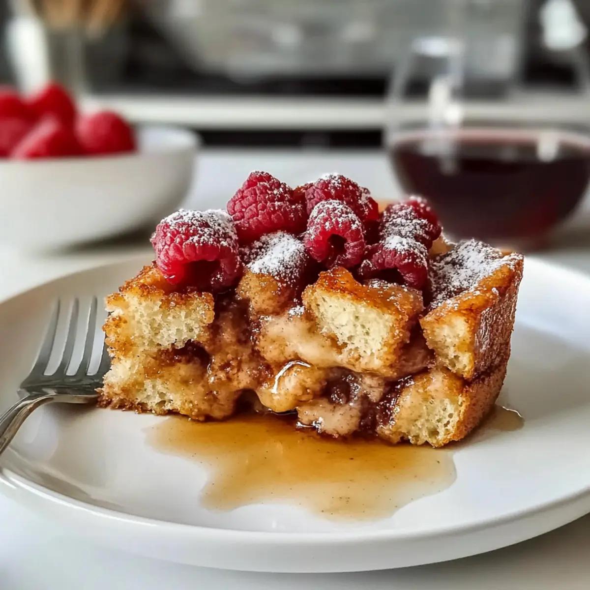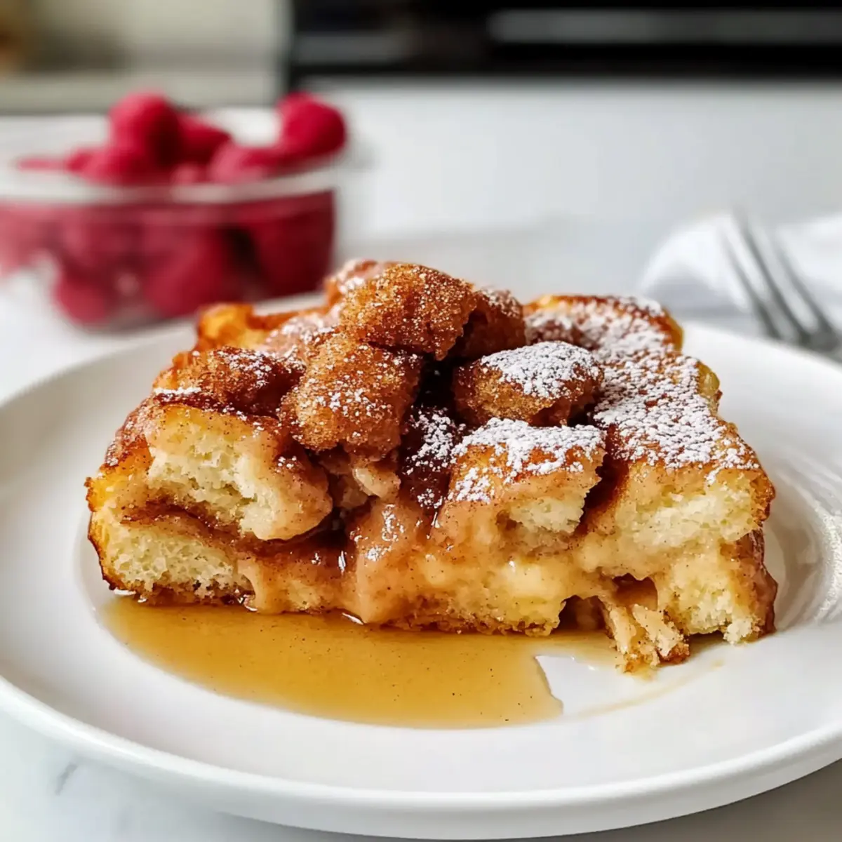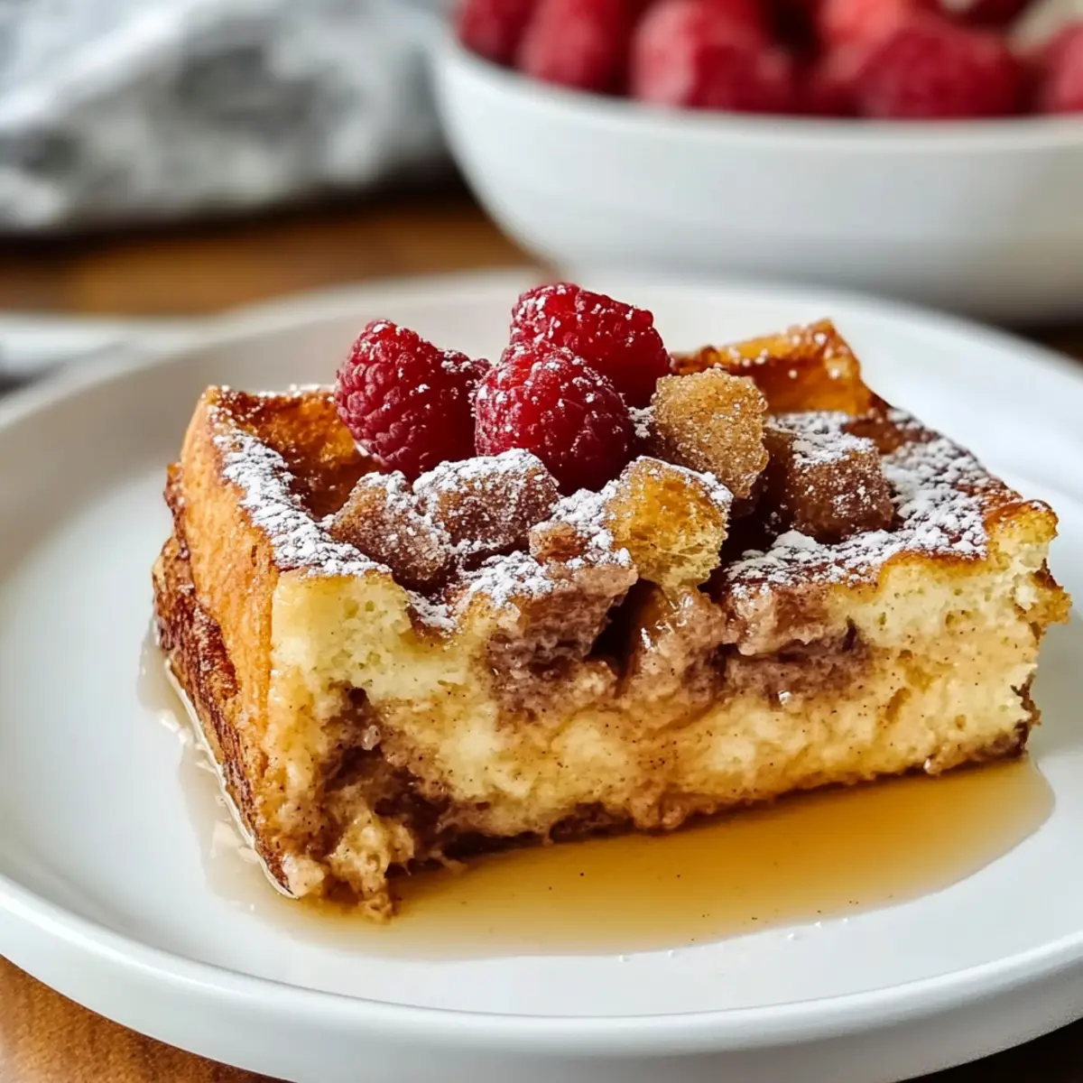 Unvergessliche Texturen: Die knusprigen Zimt-Zucker-Croûtons auf der Oberseite ergänzen perfekt die weiche, custard-soaked Schicht darunter und bieten ein tolles Geschmackserlebnis.