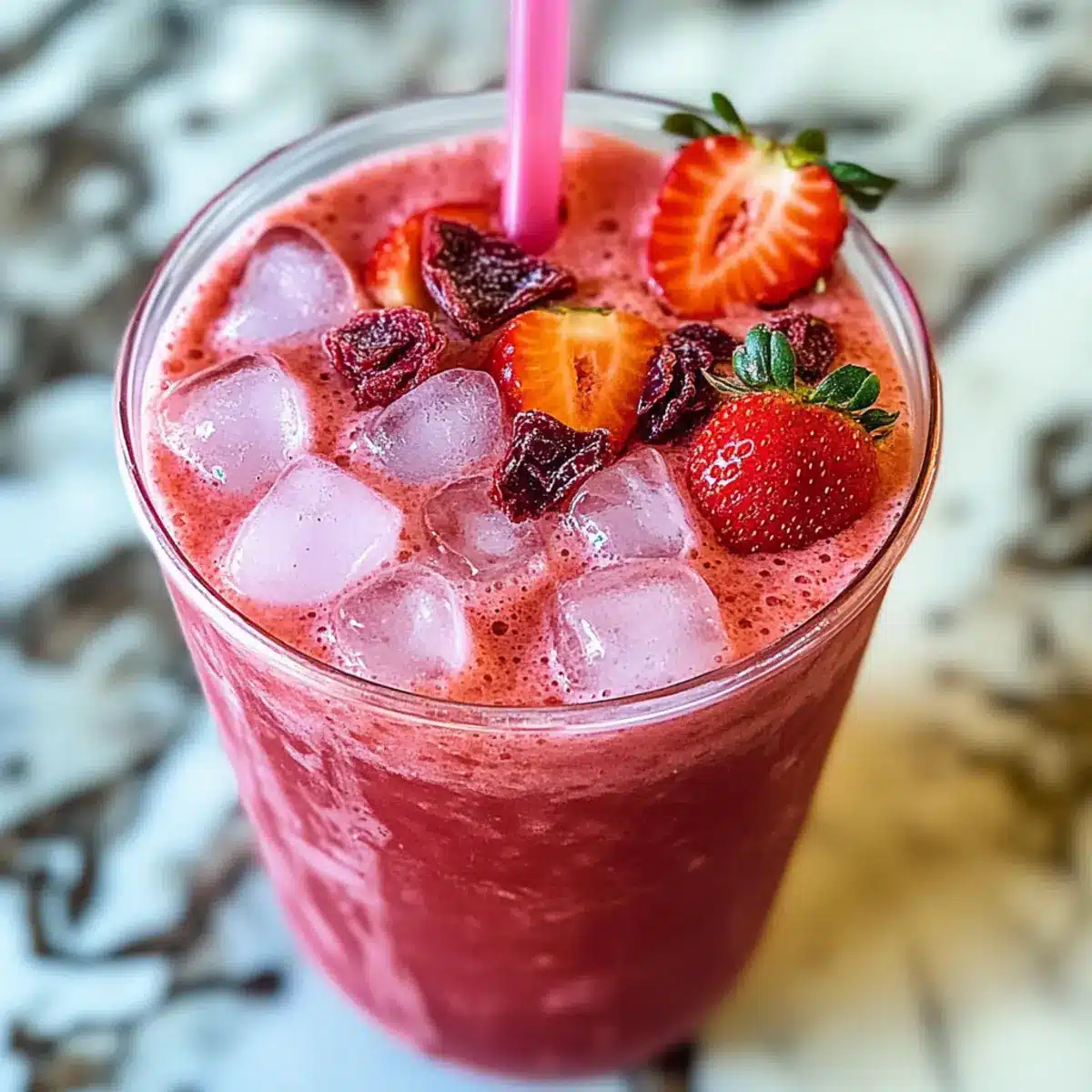 Fruchtpüree: Verwende anstelle von gefriergetrockneten Erdbeeren frisches Erdbeerpüree als Garnierung. Dieser zusätzliche Geschmack und die leuchtende Farbe werden dein Getränk noch ansprechender machen.