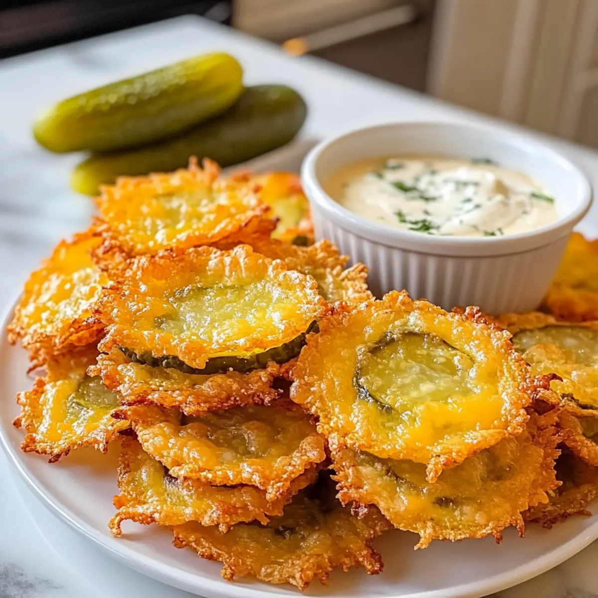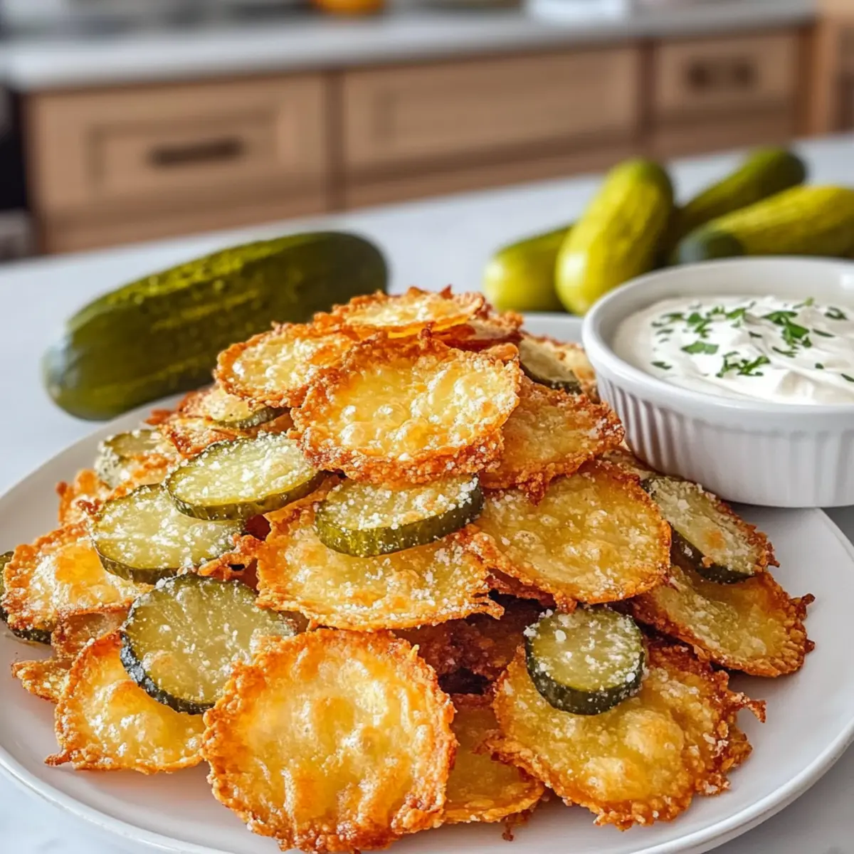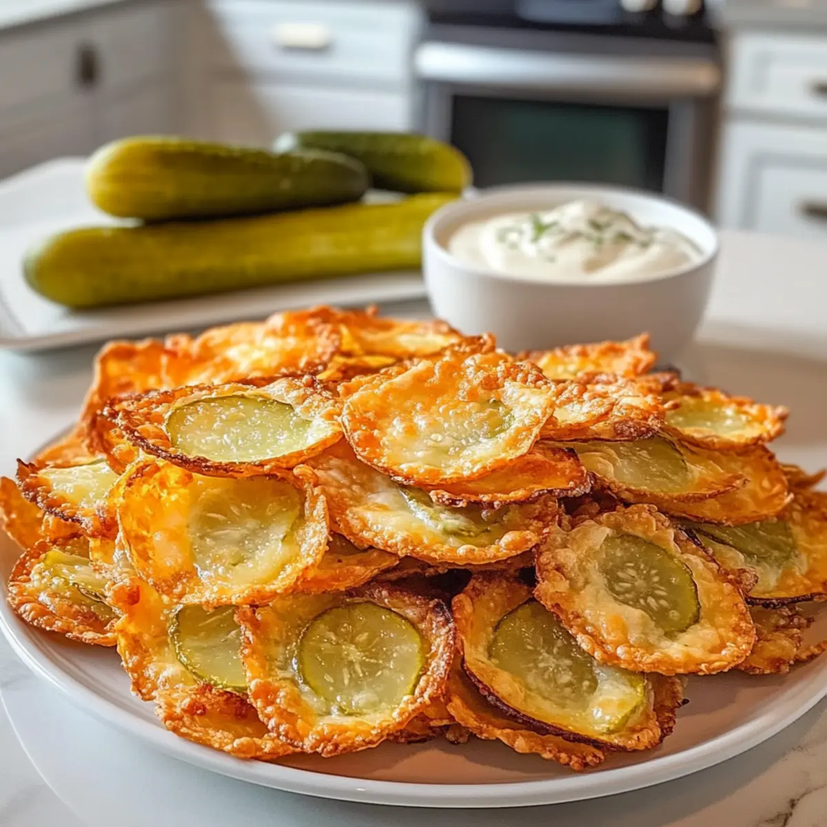 Genießen und Teilen: Diese Essiggurken-Käse-Chips sind nicht nur ein Genuss für dich, sondern ein Hit für deine Gäste! Serviere sie warm mit einem würzigen Ranch-Dip.
