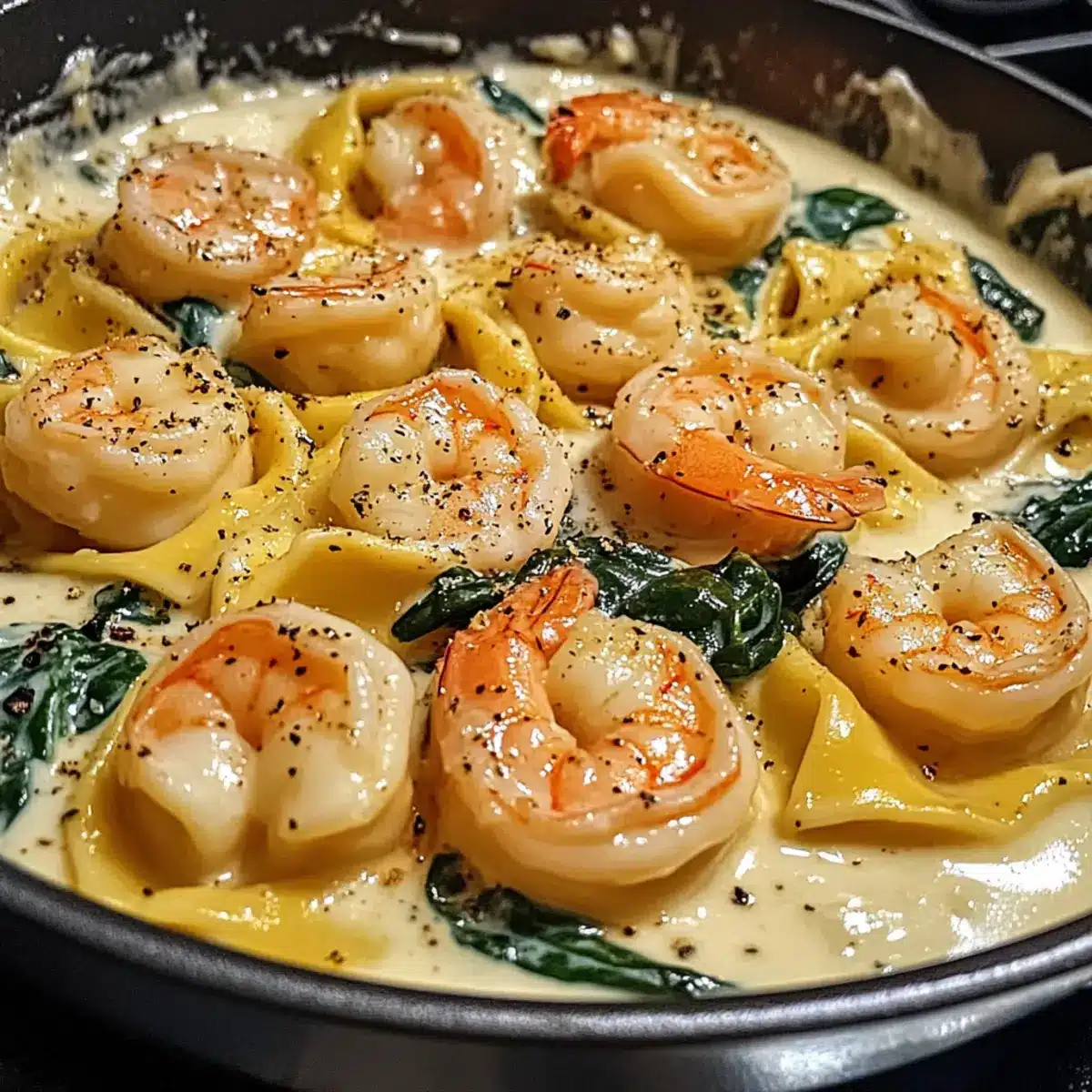 Gib die gebratenen Garnelen und den frischen Spinat in die Pfanne mit den Tortellini und der Soße. Rühre alles sanft um, bis der Spinat verwelkt ist und alles gut vermischt ist. Dies dauert etwa 2-3 Minuten. Achte darauf, dass die Tortellini nicht zerdrückt werden.
