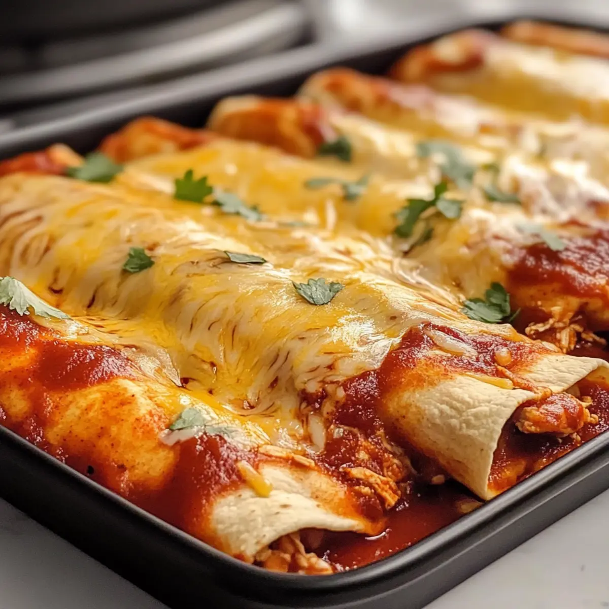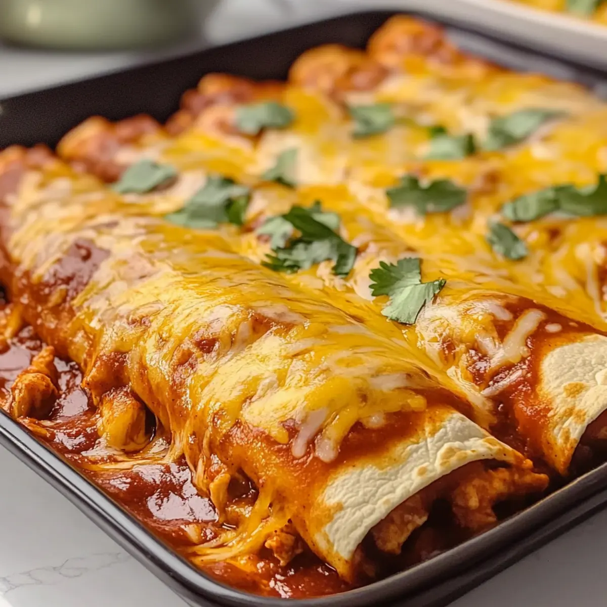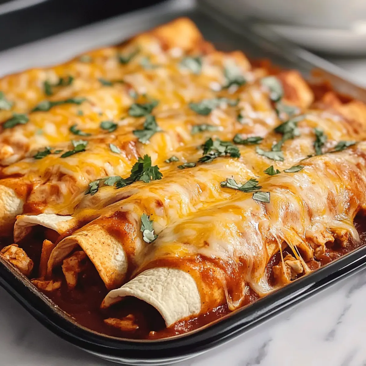Fette zwei 20×20 cm große Auflaufformen mit etwas Öl ein. Gib eine Schicht rote Enchilada-Sauce auf den Boden jeder Form. Fülle die Tortillas großzügig mit der Hähnchenmischung, rolle sie eng auf und lege sie mit der Naht nach unten in die Formen. Mit der restlichen Sauce und dem Käse bedecken.