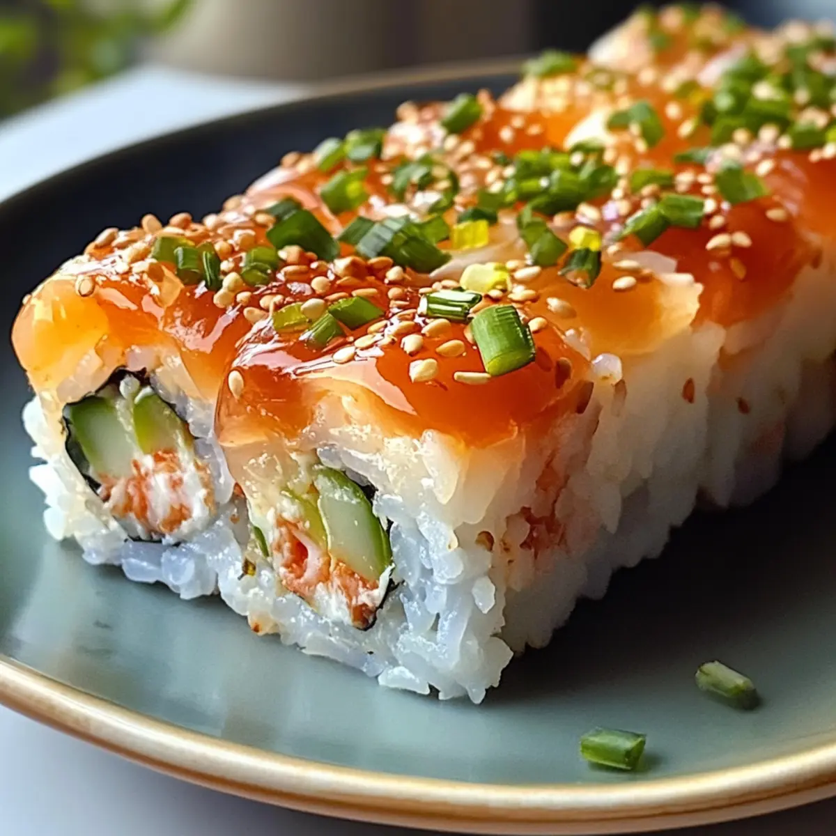 Nehme die cremige Krabbenmischung und verteile sie gleichmäßig mit einem Spatel über den gepressten Reis. Achte darauf, dass die Füllung bis in die Ecken reicht, um jeden Bissen schmackhaft zu machen. Diese Schicht ist der Höhepunkt des Gesunden Sushi-Auflaufs und sorgt für den köstlichen Geschmack.