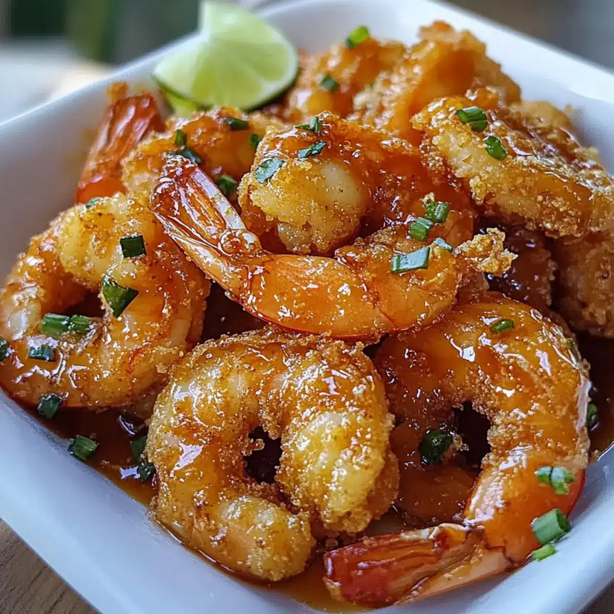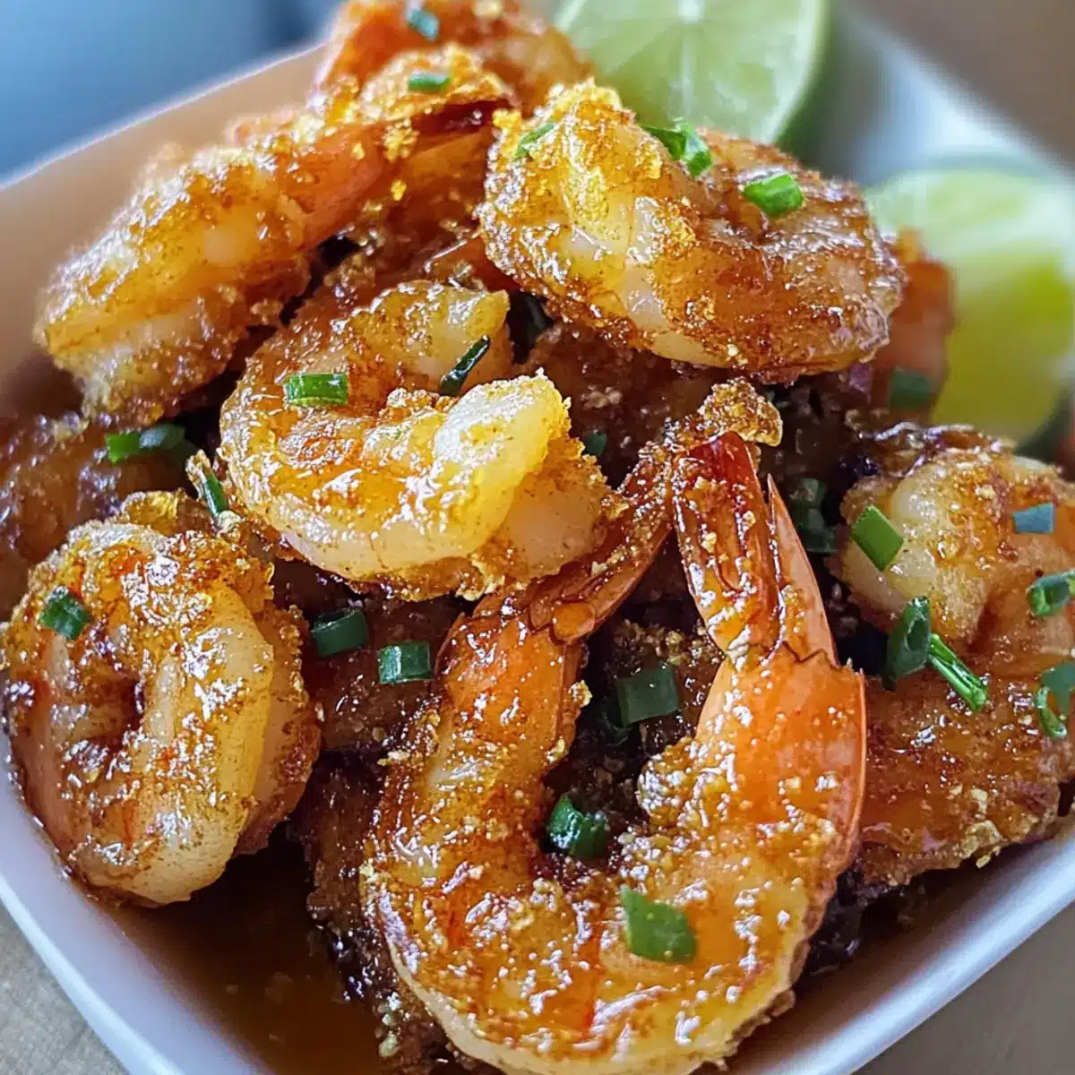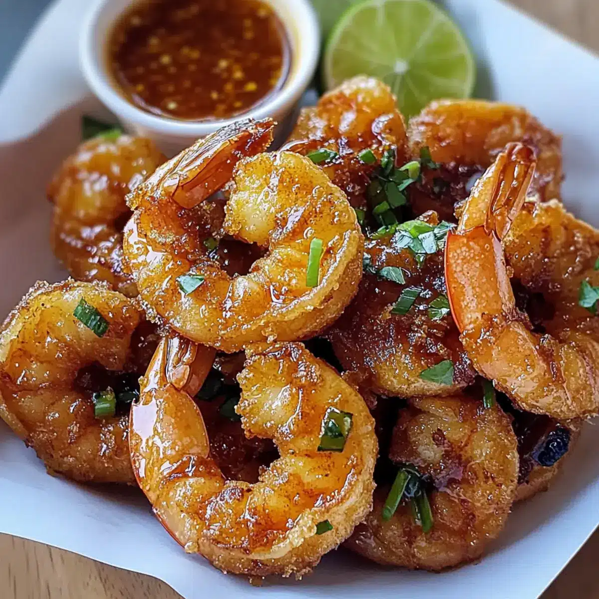 - Die frittierten Garnelen auf einem Teller anrichten und mit der Glasur beträufeln. Nach Belieben garnieren und servieren.