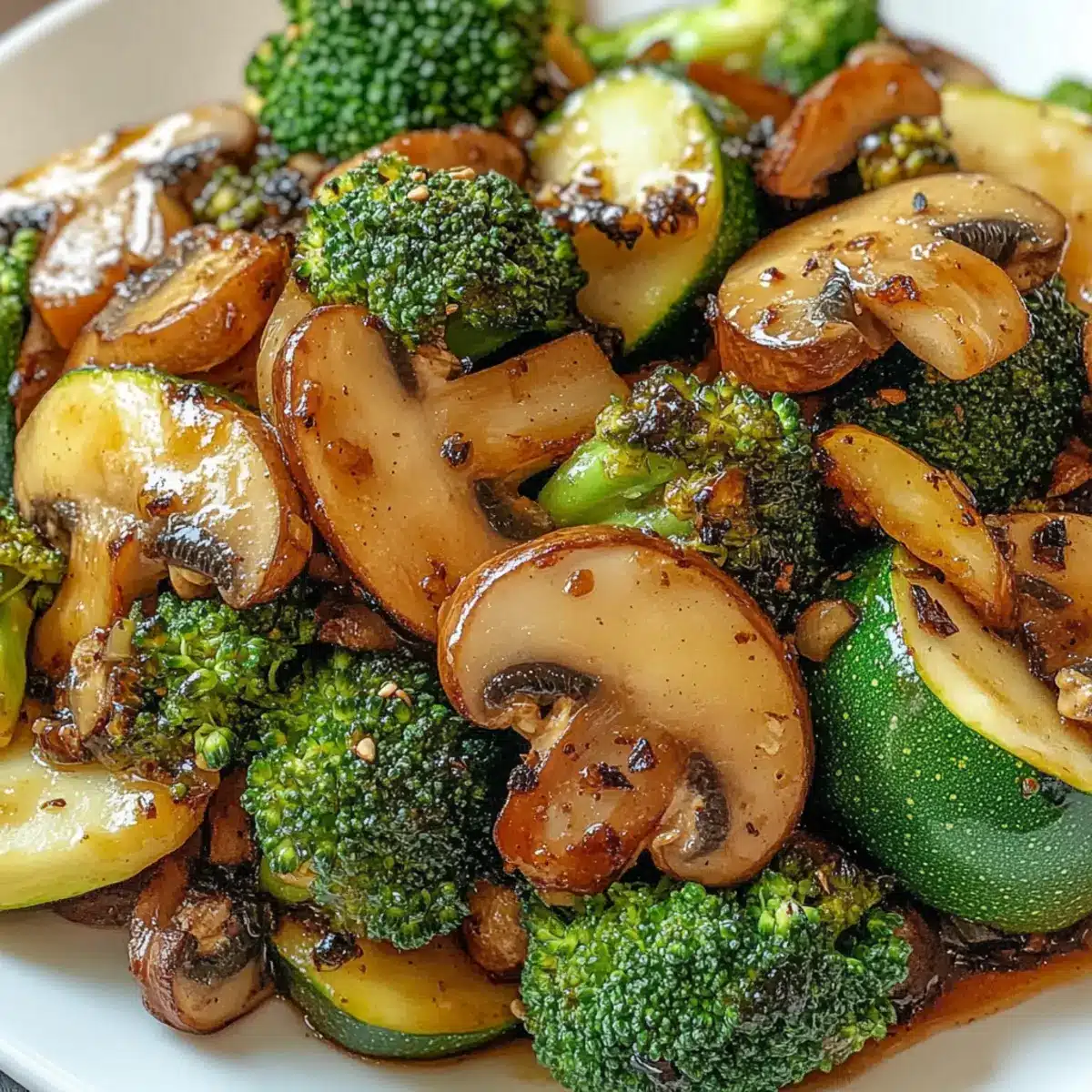 - Füge die Zucchinistücke, Brokkoli-Röschen, Champignons und Zwiebelstücke hinzu und sautierte sie für 4-5 Minuten.