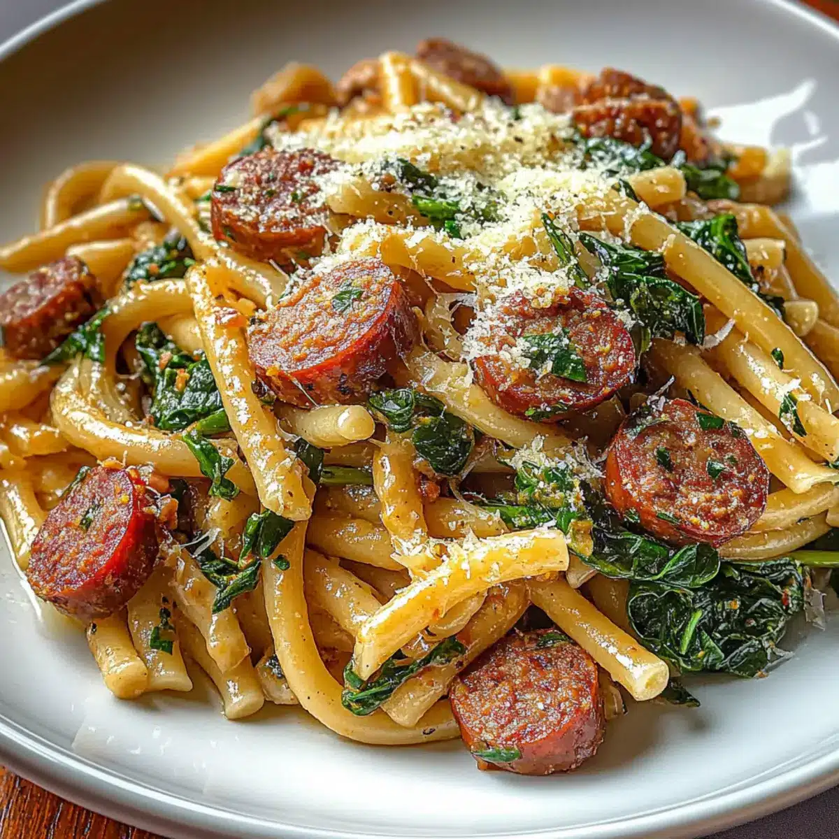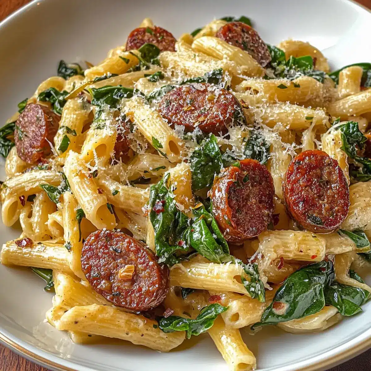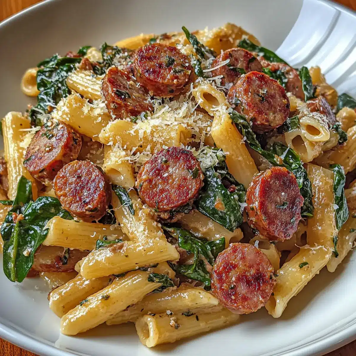 Fügt die gekochte Pasta, den frischen Spinat und die Hälfte des geriebenen Parmesan-Käses in die Pfanne hinzu. Wendet alles vorsichtig, bis die Pasta gut mit der Sauce überzogen ist und der Spinat verwelkt. Diese Kombination verleiht der Pasta nicht nur Farbe, sondern auch zusätzliche Nährstoffe.