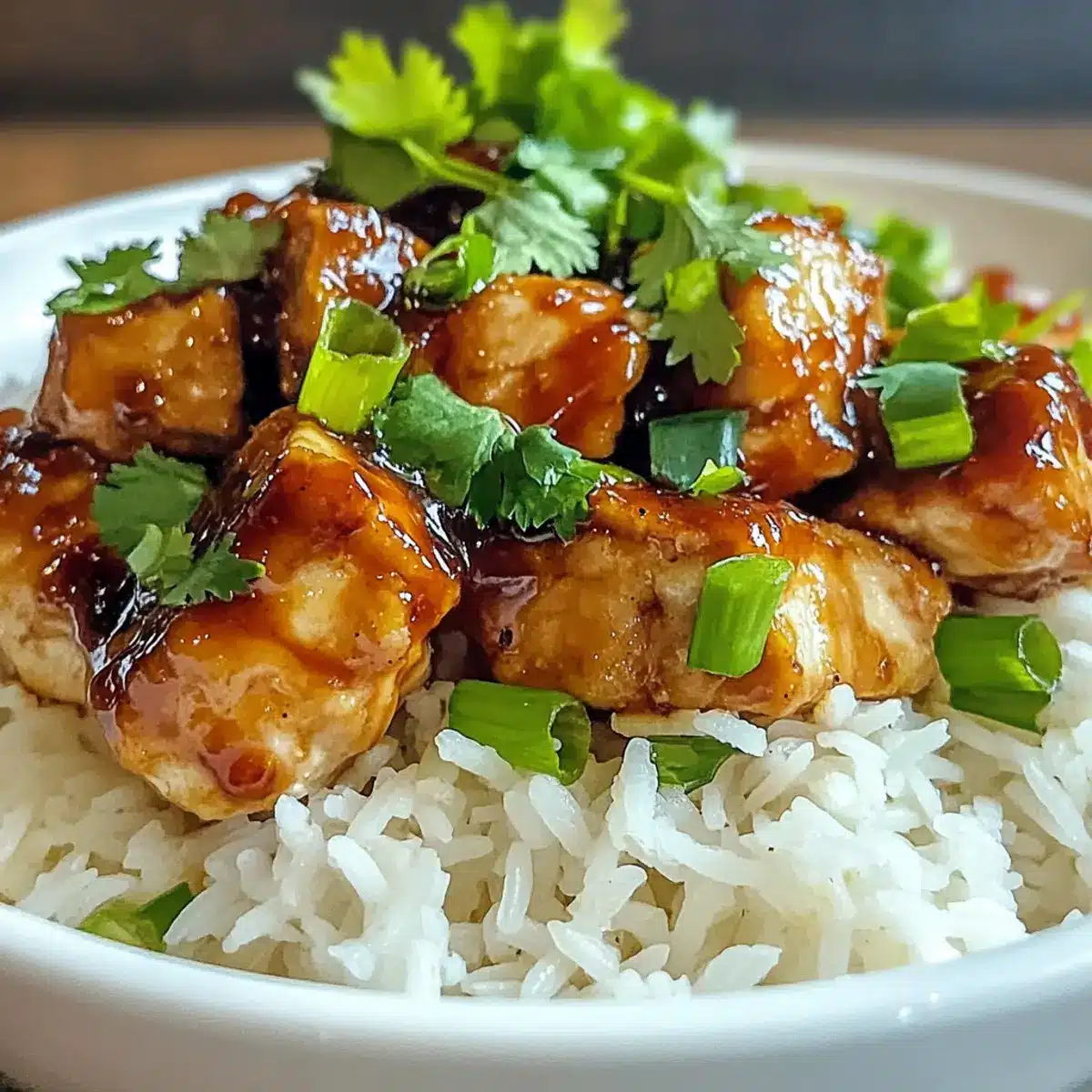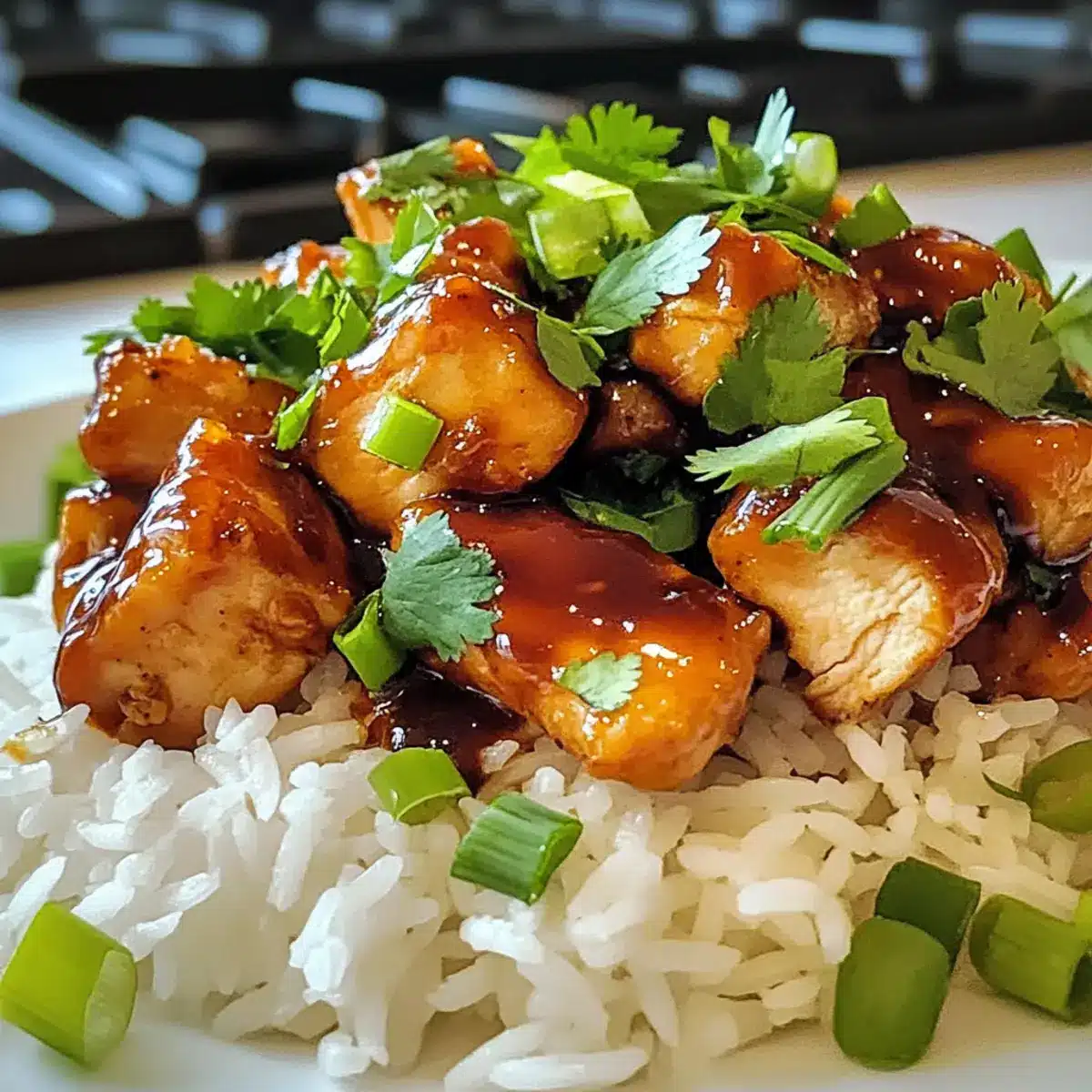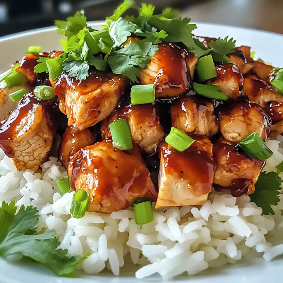 Wenn der Reis fertig ist, fluffe ihn mit einer Gabel auf und verteile ihn in Schüsseln. Lege das honig-glasiertes BBQ-Hähnchen darauf und garniere das Gericht mit frisch geschnittenen Frühlingszwiebeln und gehacktem Koriander, um einen Farbtupfer und zusätzlichen Geschmack hinzuzufügen.