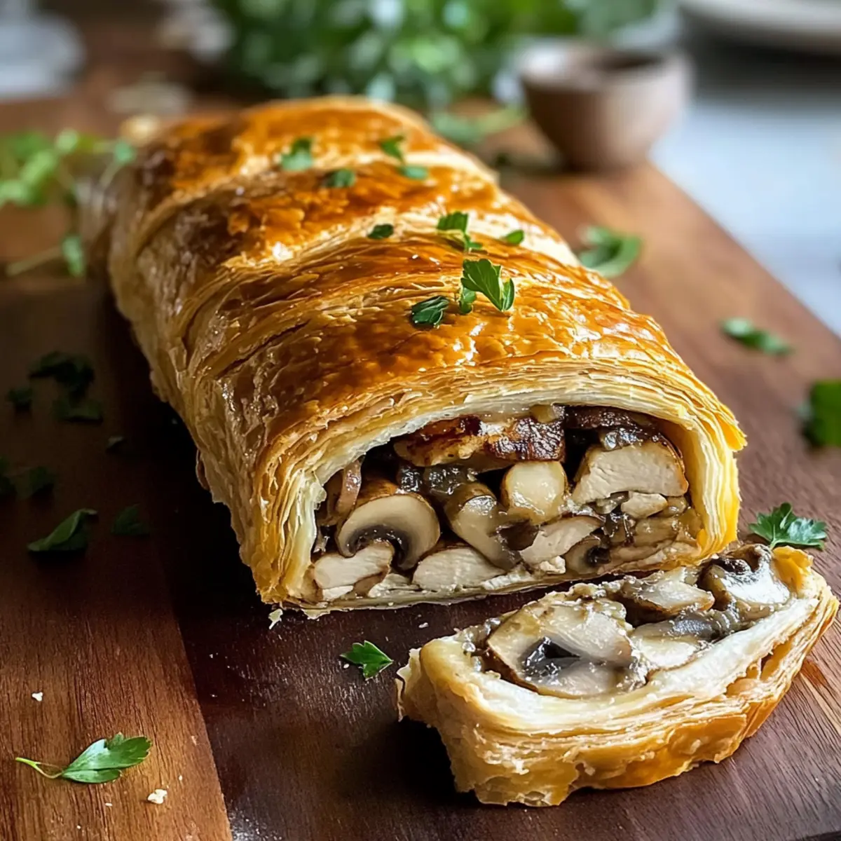 Präsentation: Für eine ansprechende Präsentation schneide das Hühnchen Wellington in medallionartige Stücke und serviere es auf einem rustikalen Holzbrett.