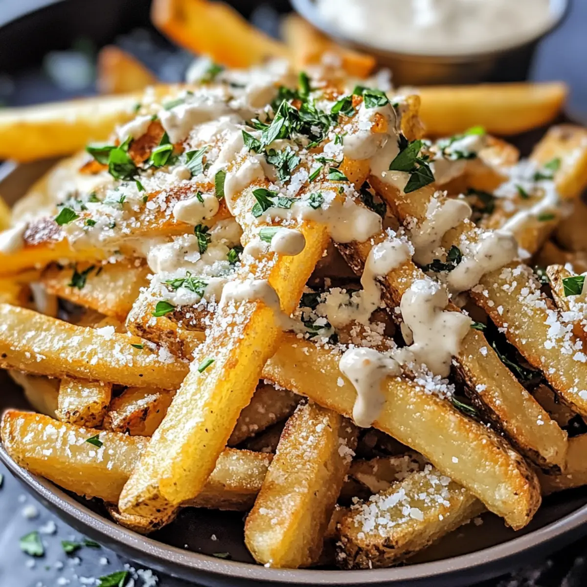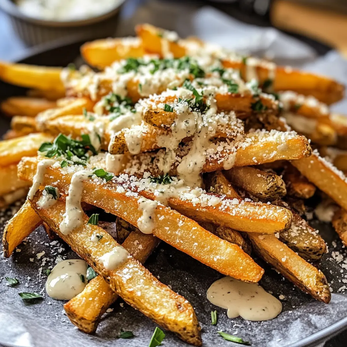 Diese knusprigen Knoblauch-Parmesan-Pommes Frites mit Caesar-Dressing sind schnell gemacht und eine hervorragende Wahl für jede Gelegenheit!