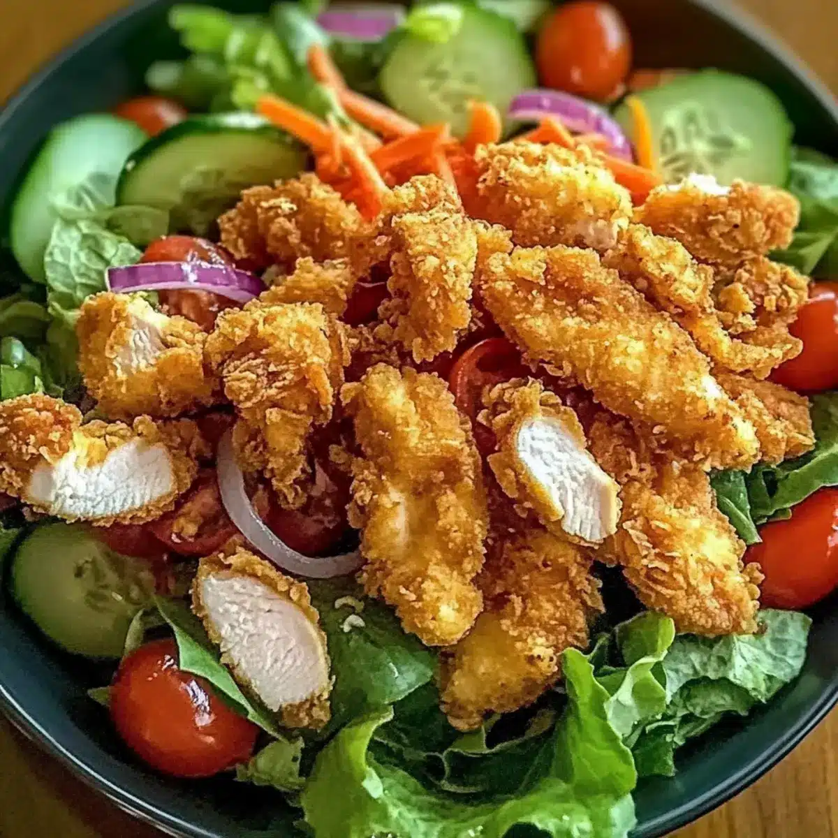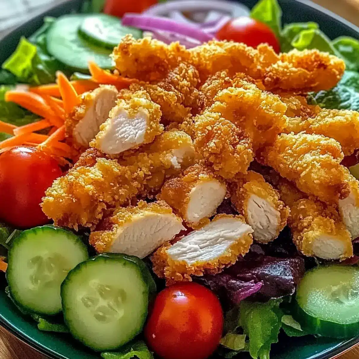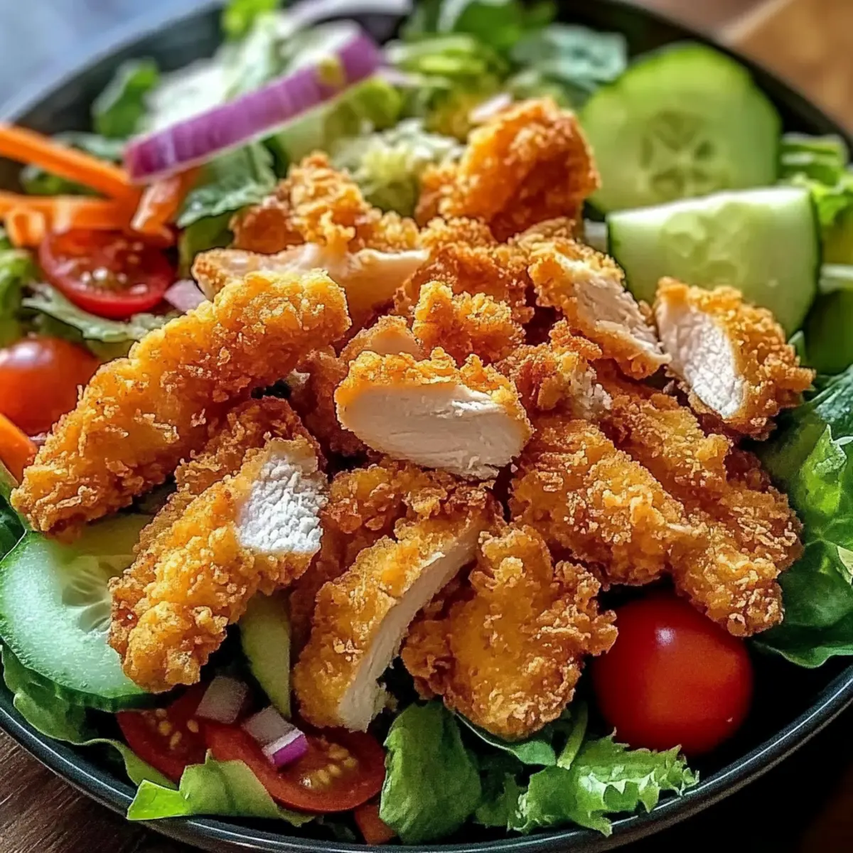 Knusprige Textur: Der frisch frittierte Hähnchenteile verleihen jedem Bissen eine köstliche Knusprigkeit, die mit dem knackigen Gemüse harmonisch zusammenpasst. Einfachheit: Die Zubereitung ist unkompliziert und erfordert nur grundlegende Kochfähigkeiten, sodass du schnell ein schmackhaftes Gericht zaubern kannst. Vielseitigkeit: Dieser Salat ist anpassbar! Experimentiere mit verschiedenen Dressings wie Balsamico-Vinaigrette oder füge saisonale Zutaten hinzu, um Abwechslung zu schaffen. Schneller Genuss: In nur 40 Minuten bist du bereit, ein Gourmetgericht zu genießen – perfekt für einen hektischen Abend! Ansprechend für die ganze Familie: Mit seiner bunten Mischung aus frischem Gemüse und knusprigem Hähnchen wird dieser Salat garantiert alle begeistern.