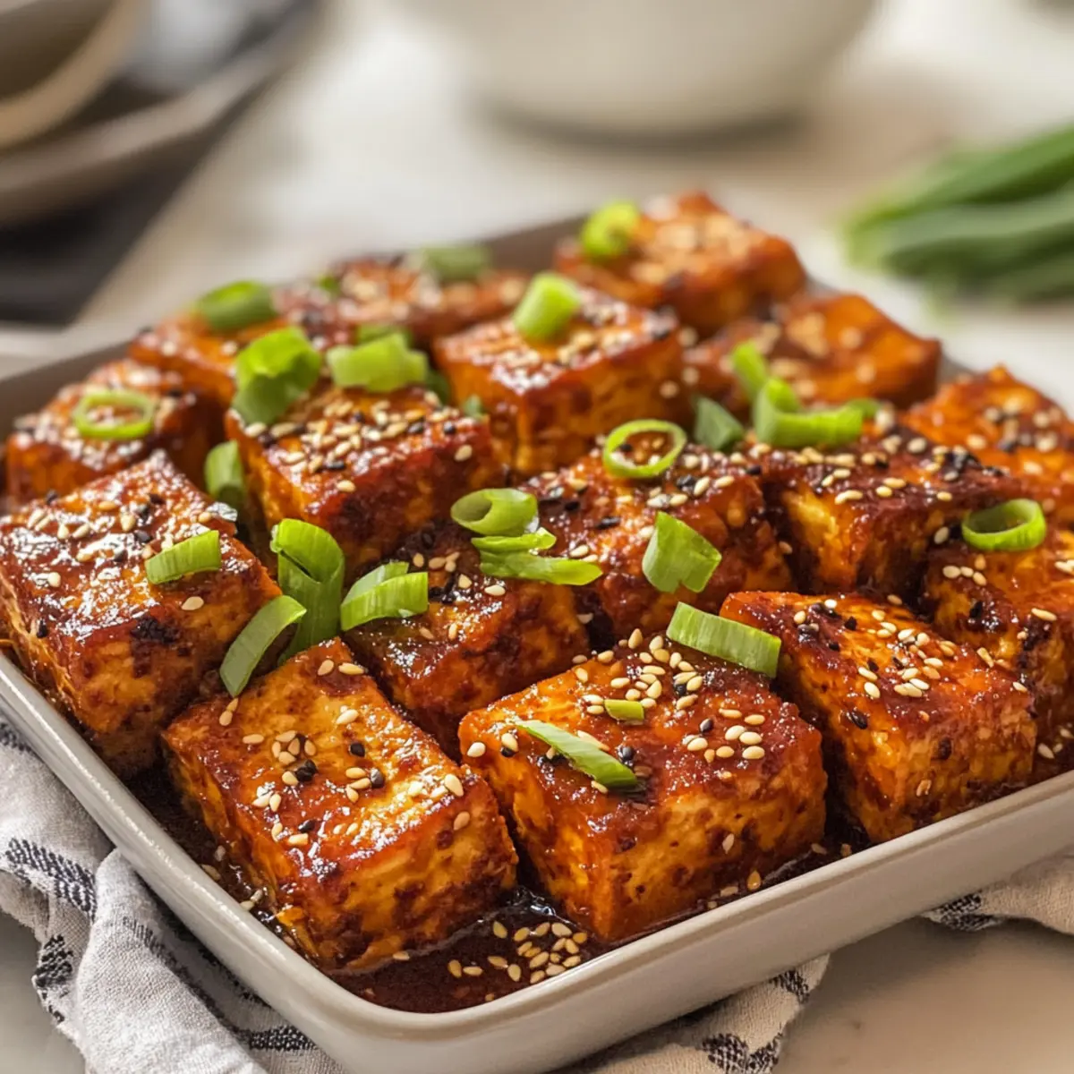 - Tofu anrichten und mit Frühlingszwiebeln und Sesamkörnern garnieren.