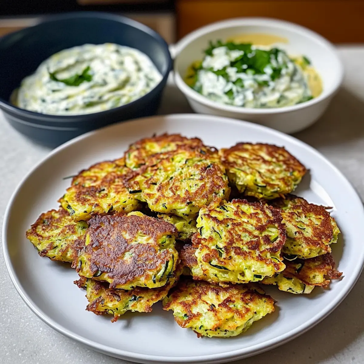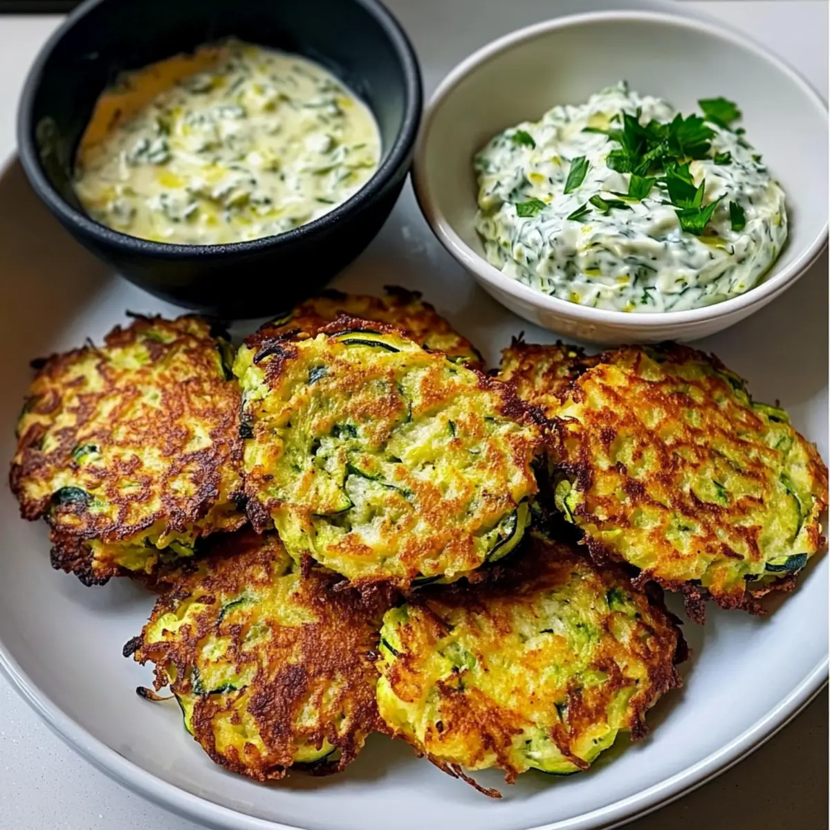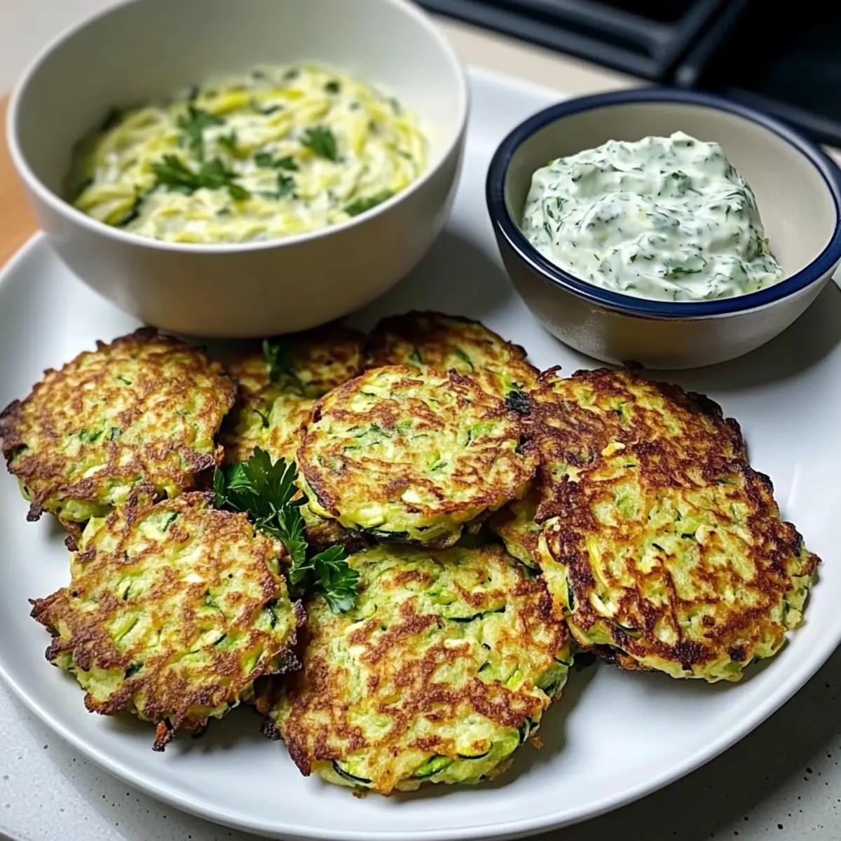 Genießen Sie die knusprigen Zucchini-Puffer als Teil eines vollständigen, köstlichen Essens, das die Sinne anspricht.