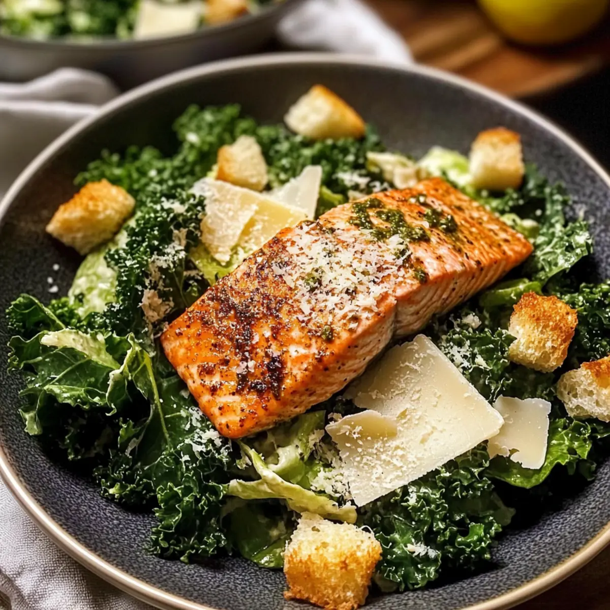 Achte darauf, dass der Lachs frisch und von hoher Qualität ist; er sollte eine lebendige Farbe und einen milden, frischen Geruch haben. Für den Grünkohl wähle zarte, dunkelgrüne Blätter ohne braune oder welke Stellen. Für die Croutons solltest du Focaccia verwenden, die frisch und nicht trocken ist, damit sie beim Backen perfekt knusprig wird.