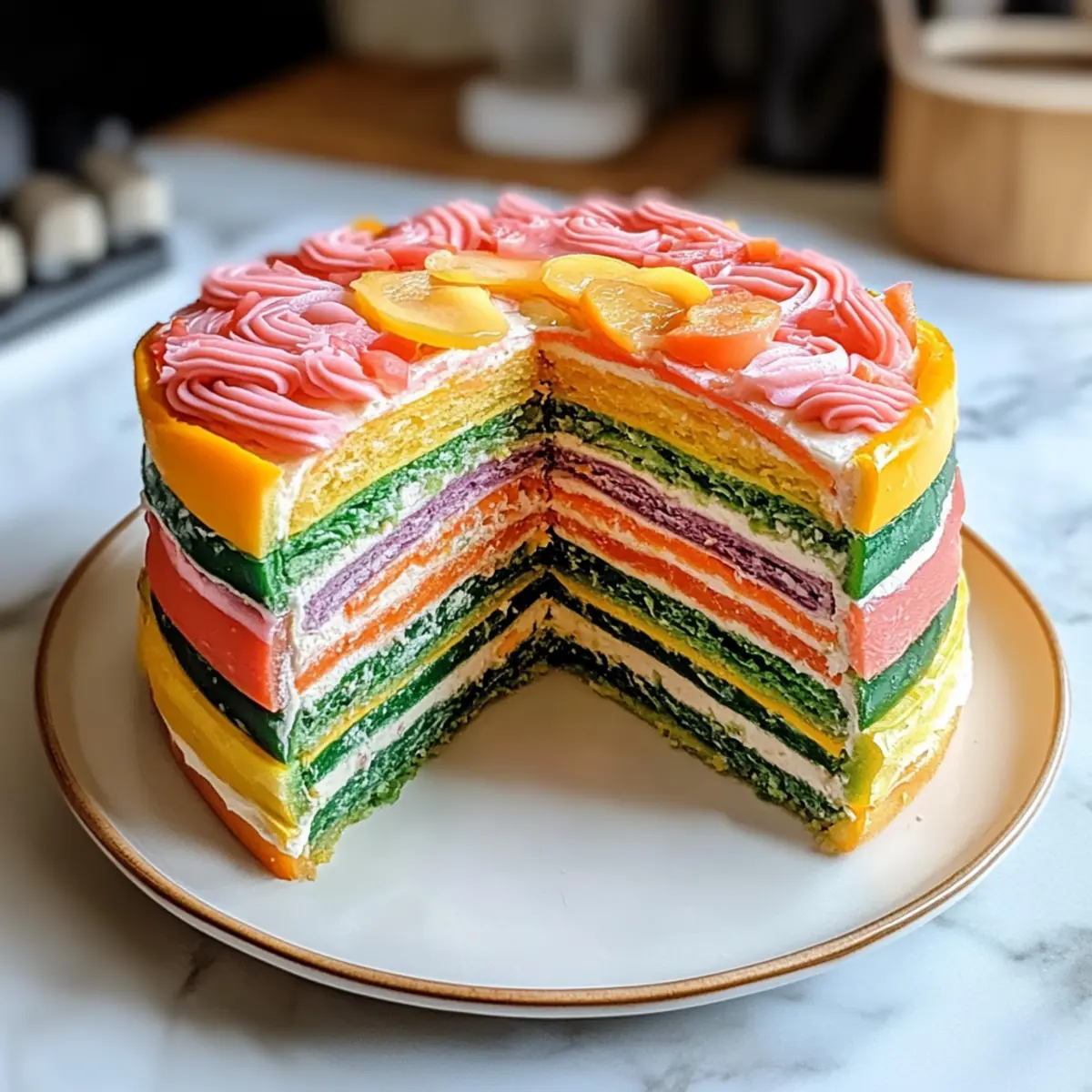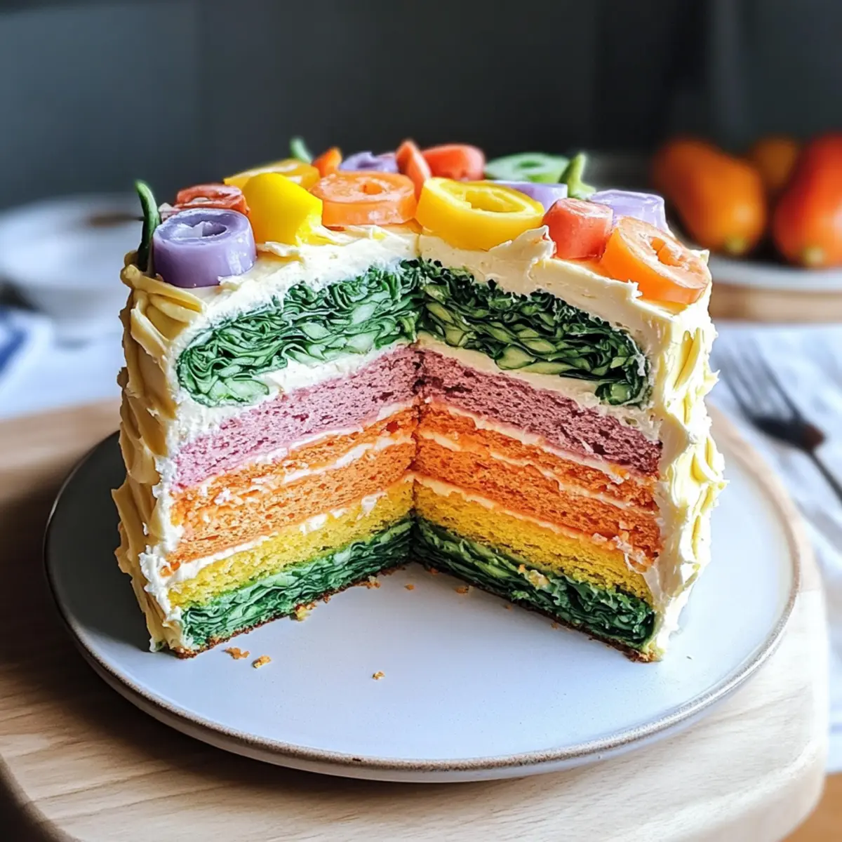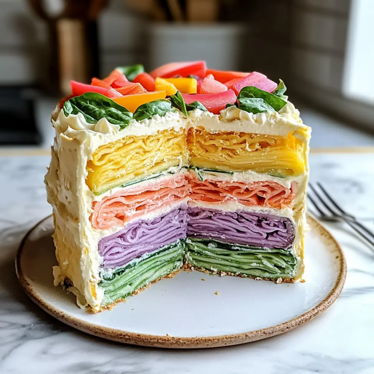 Farbenfrohes Erlebnis: Die leckere bunte Regenbogen Gemüse Torte ist ein wahrer Hingucker auf jedem Tisch – sie bringt nicht nur Farbe, sondern auch Freude!