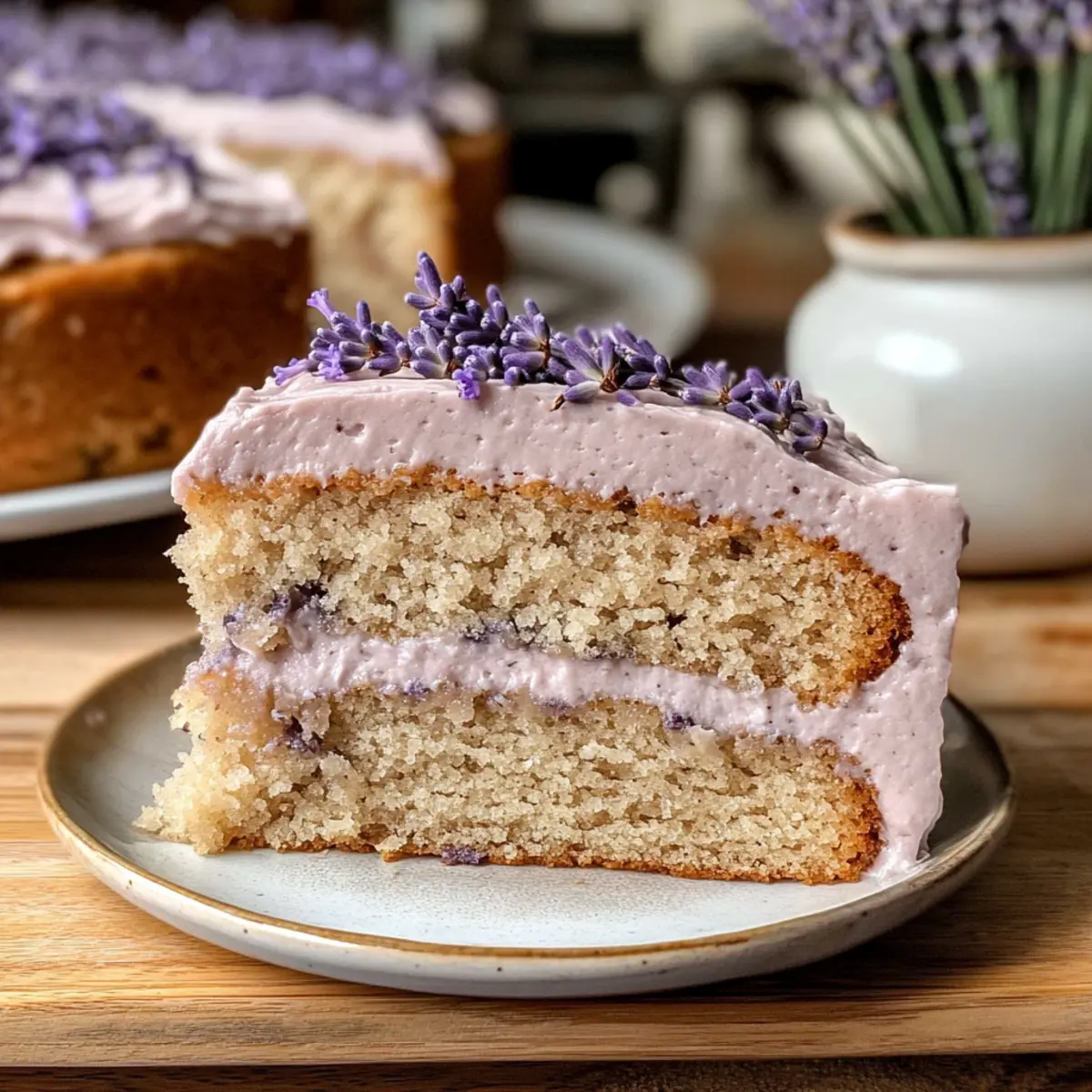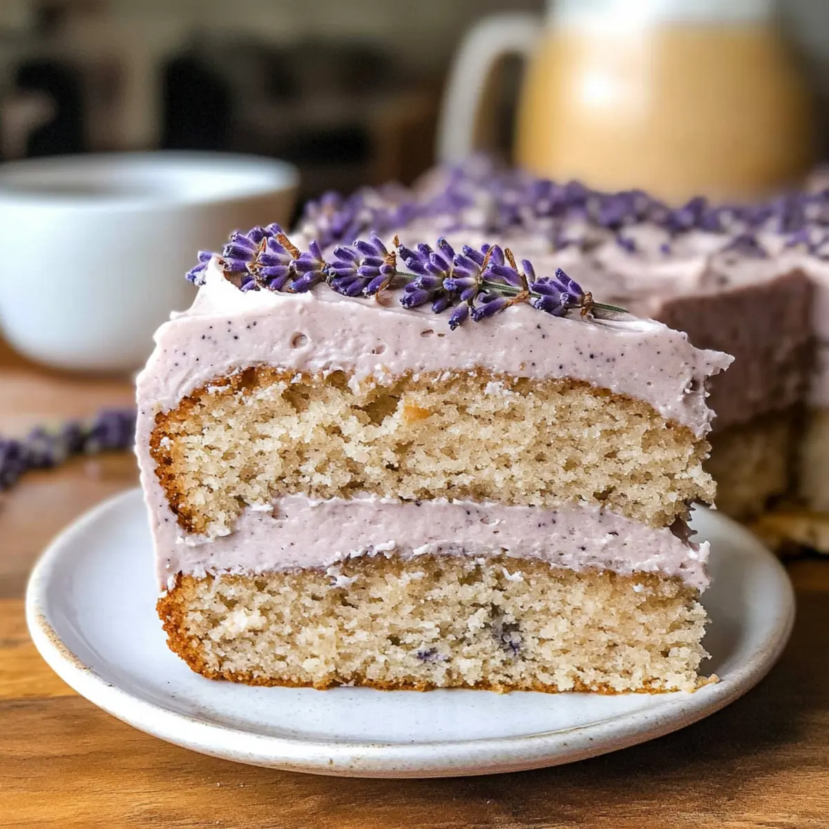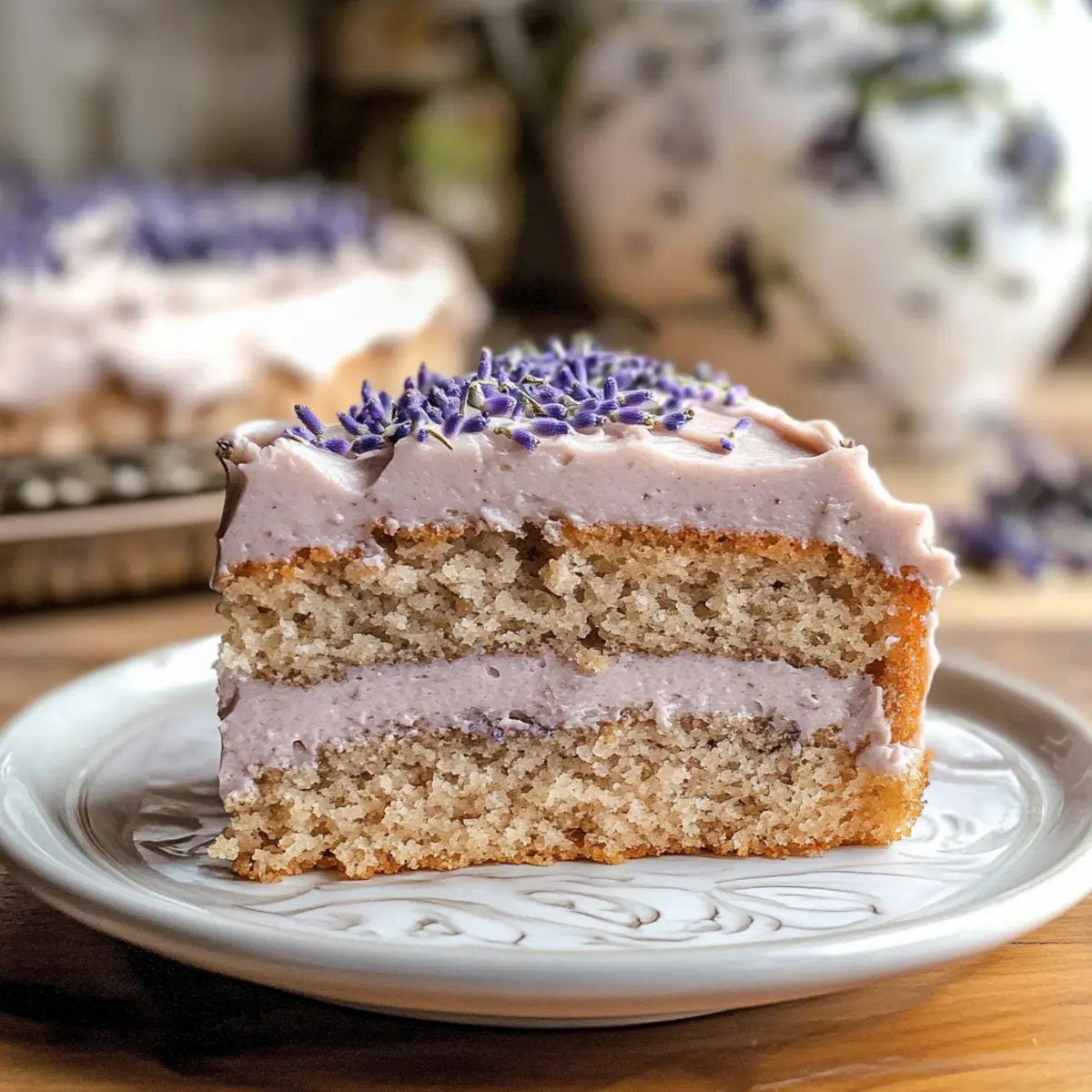 - Dekoriere den Kuchen großzügig mit dem Lavendel Cream Cheese Frosting und serviere ihn.