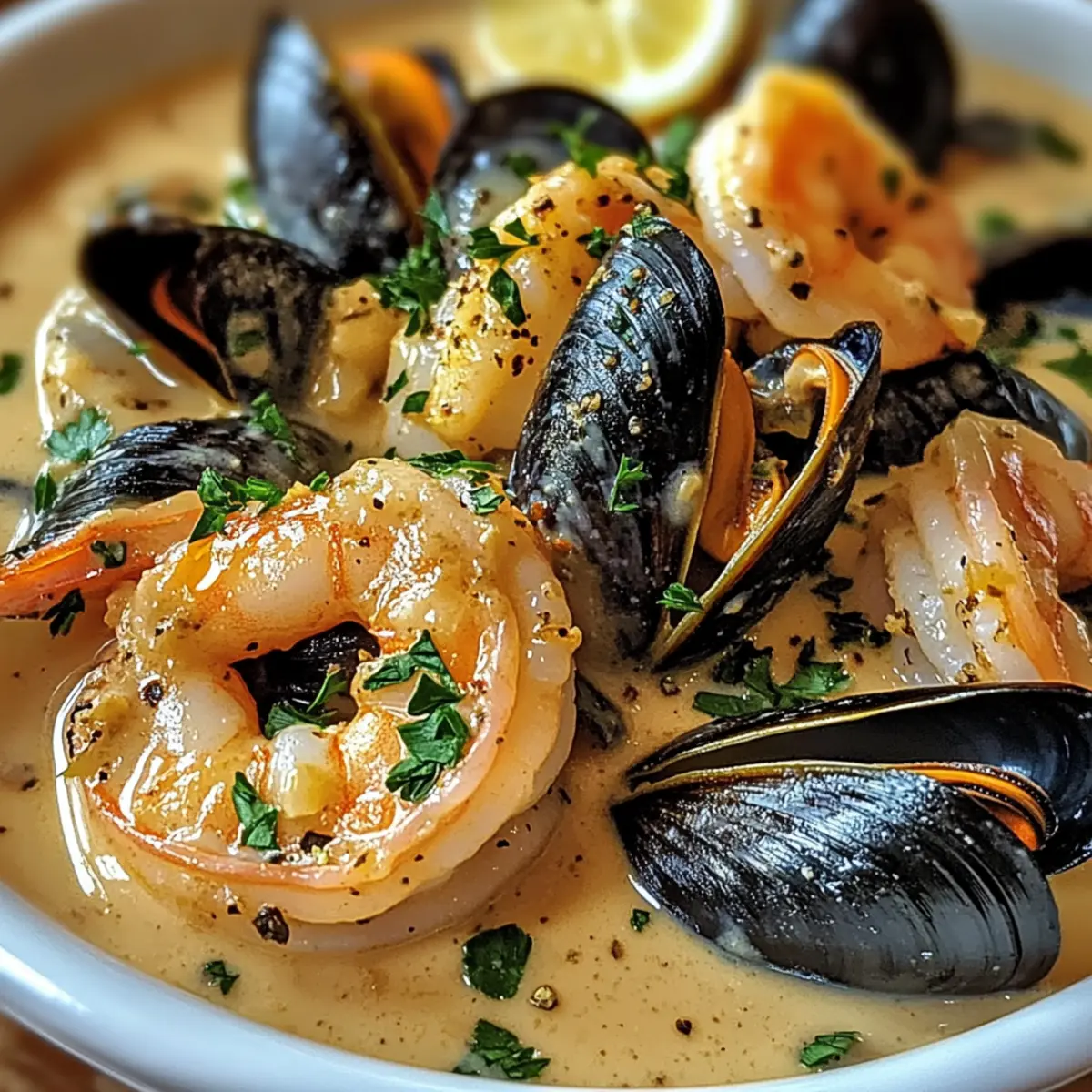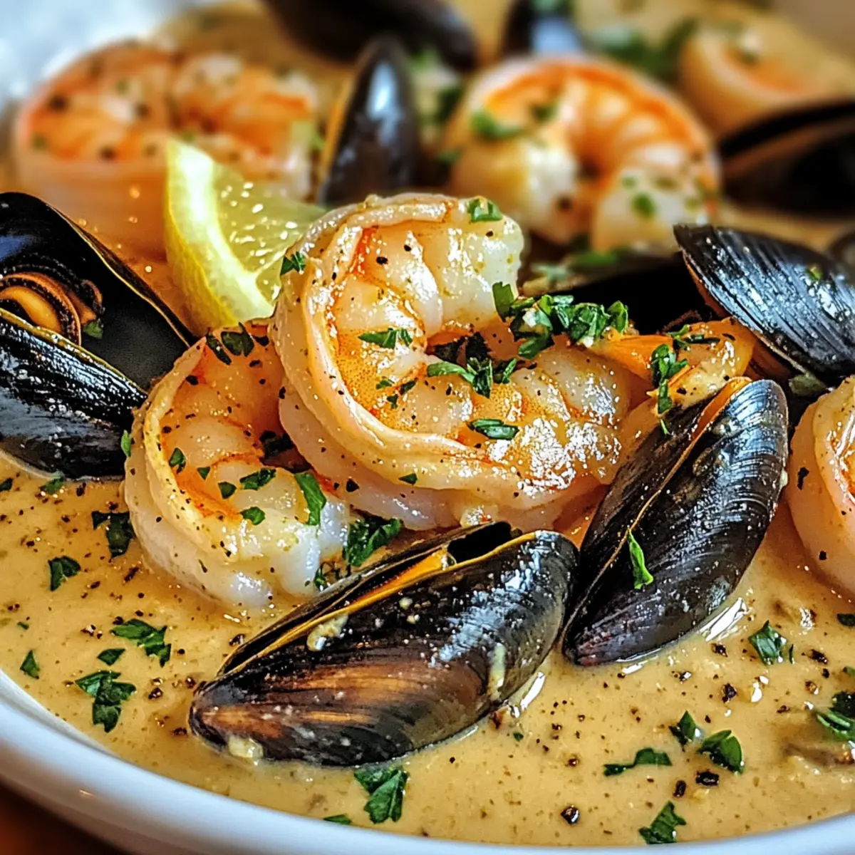 - Serviere die Shrimps und Muscheln sofort, garniere mit frischer Petersilie.