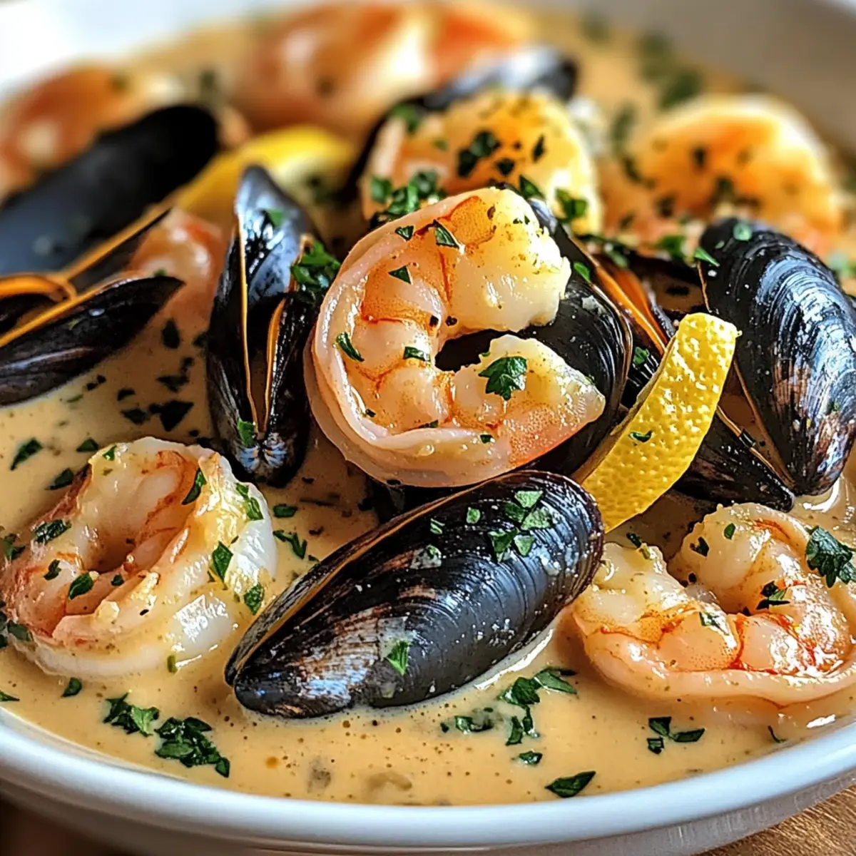 Für eine vegane oder vegetarische Variante kannst du die Muscheln und Shrimps durch saisonales Gemüse wie Zucchini oder Pilze ersetzen. Verwende anstelle von Sahne eine pflanzliche Alternative, um eine cremige Konsistenz zu erhalten. Kräuter und Gewürze können ebenfalls angepasst werden, um den Geschmack zu intensivieren.