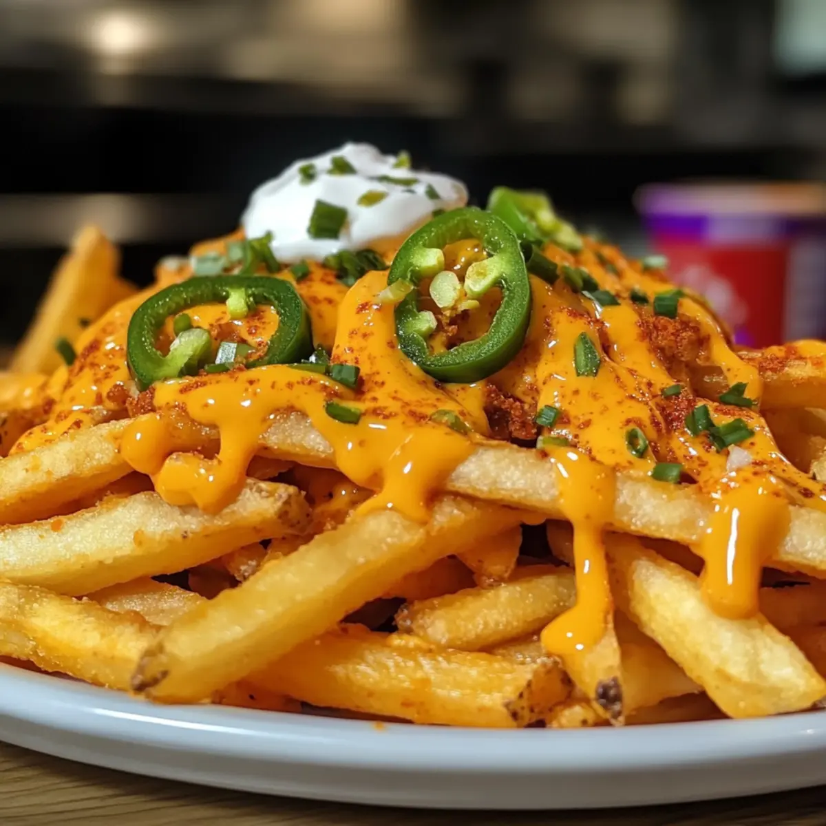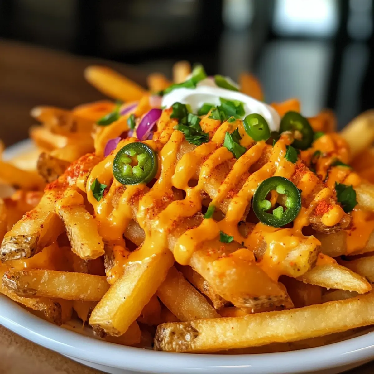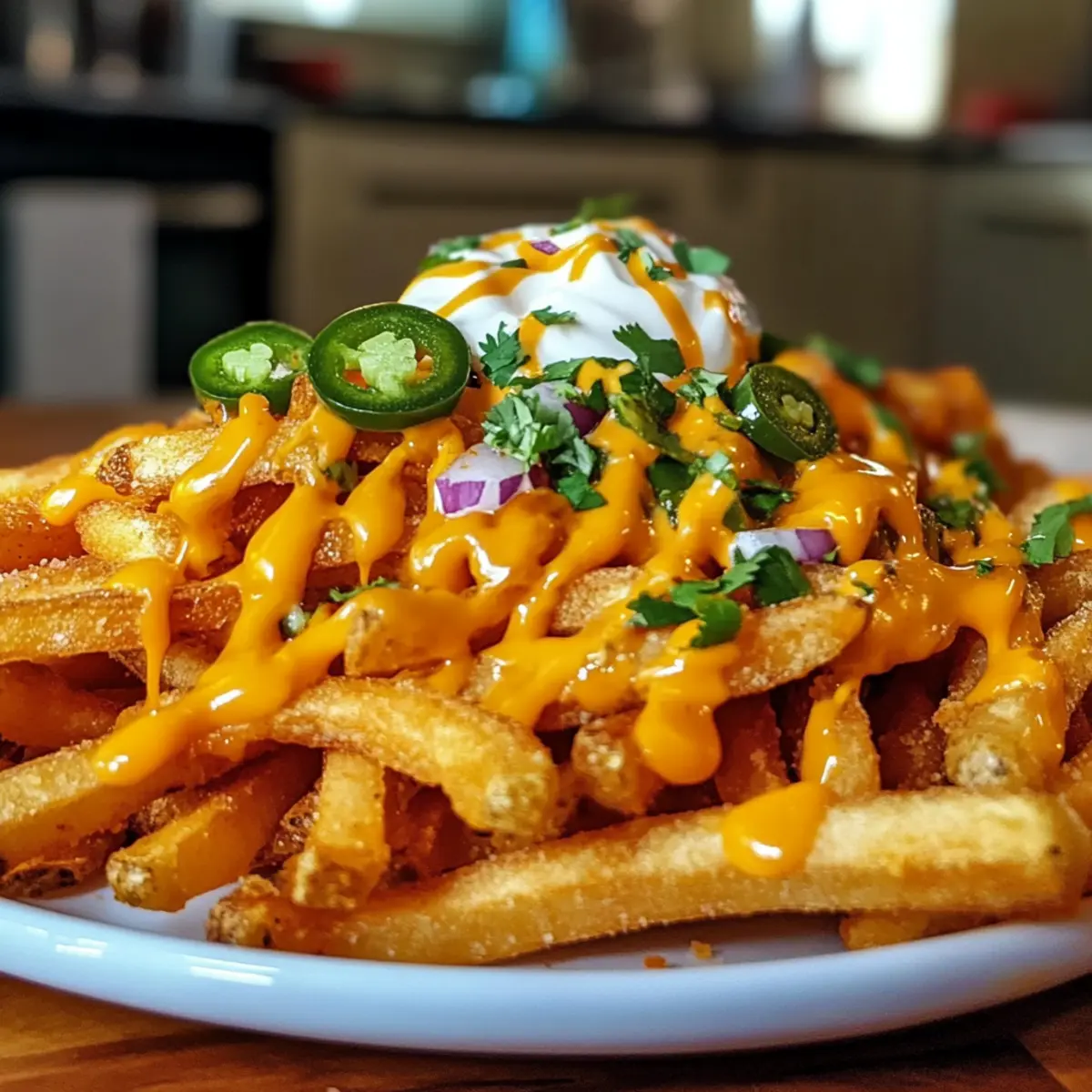 - Dekoriere die Pommes mit optionalen Toppings wie Jalapeños, Sauerrahm oder Guacamole.
