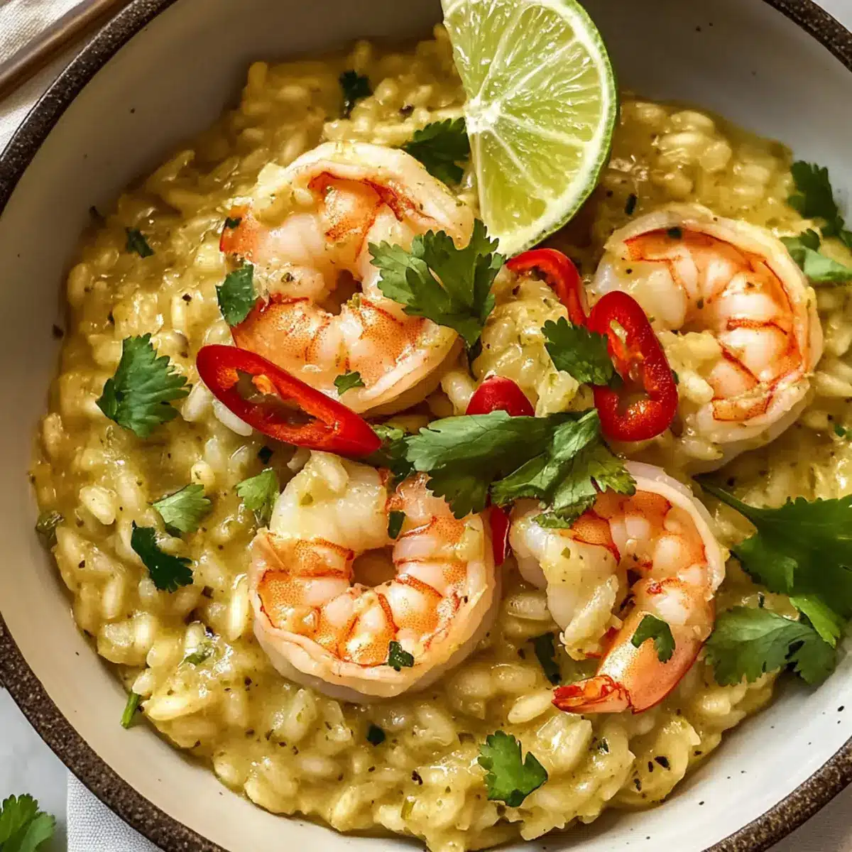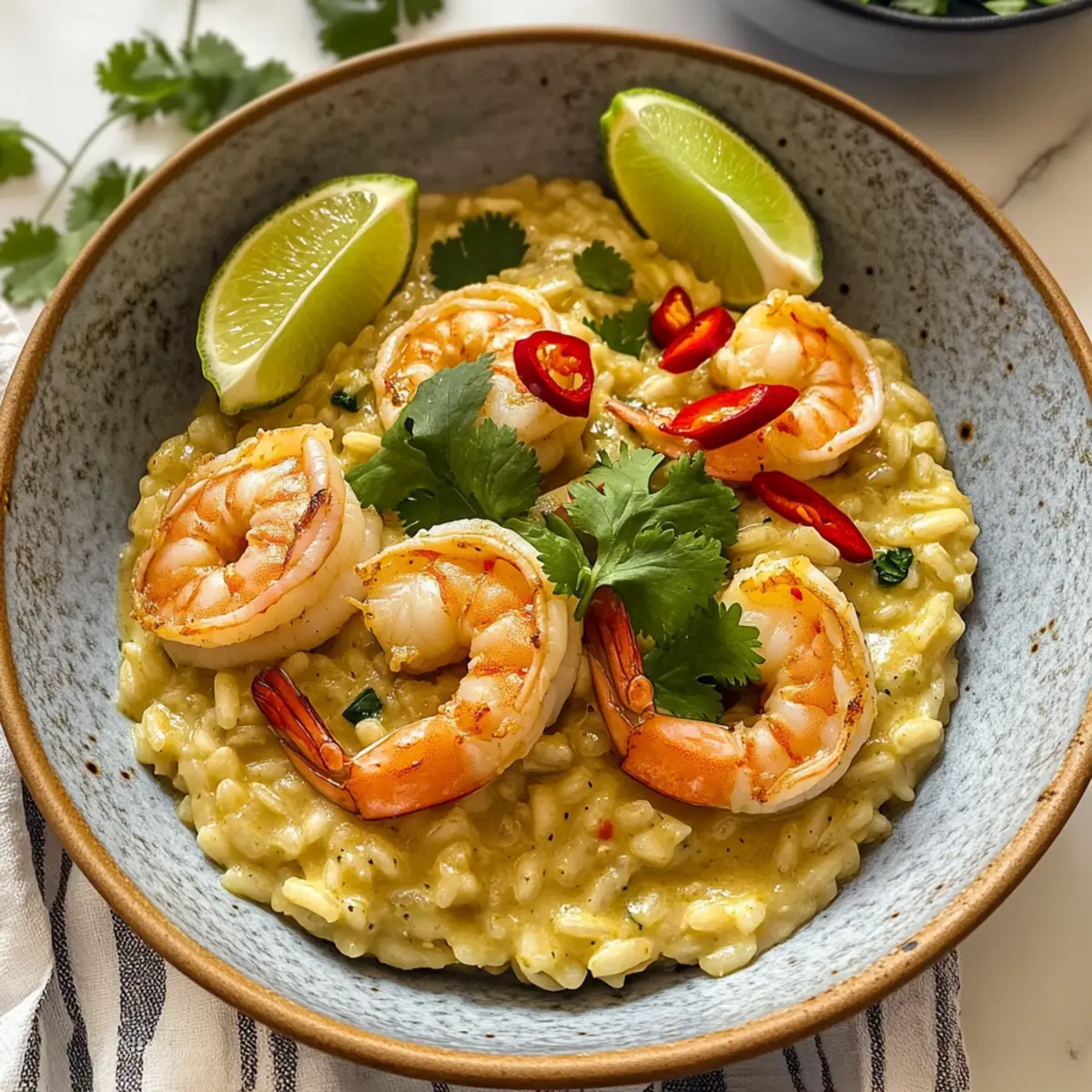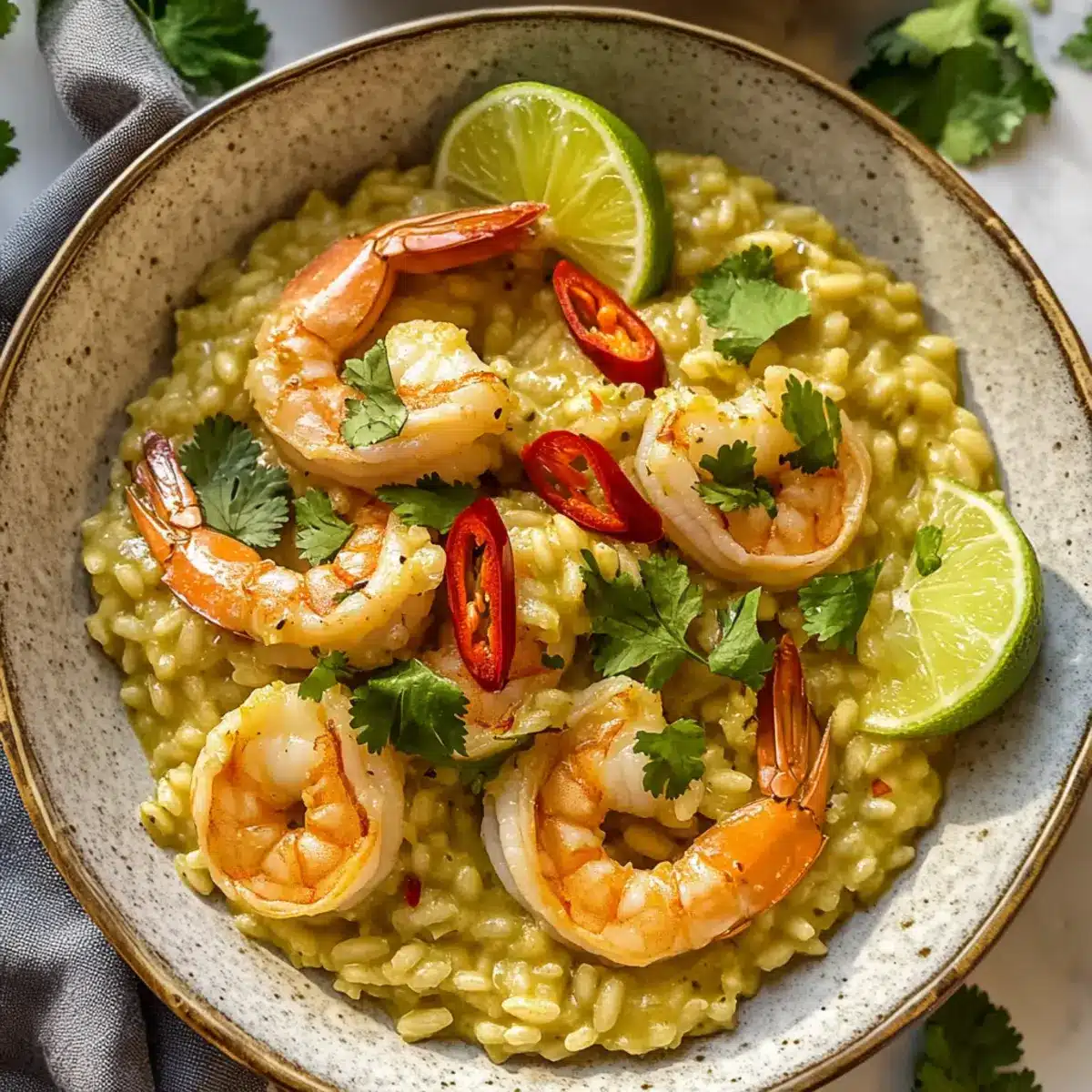 - Fügen Sie die zuvor gebratenen Garnelen in die Pfanne mit dem Risotto hinzu und rühren Sie vorsichtig unter. Lassen Sie das Gericht kurz ziehen und garnieren Sie es mit frischen Limettenvierteln, Koriander und geschnittenen roten Chilischoten.