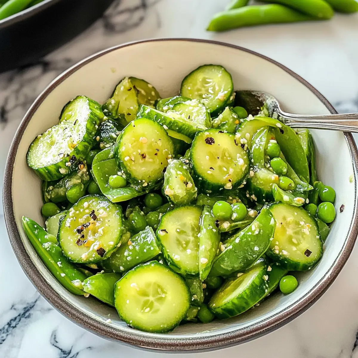 Erfrischend und leicht: Dieser Zerdrückte Gurken-Snap-Erbsen-Salat bietet die perfekte Kombination aus knackigen Texturen und lebhaften Aromen, die dich an einen sommerlichen Tag erinnern.