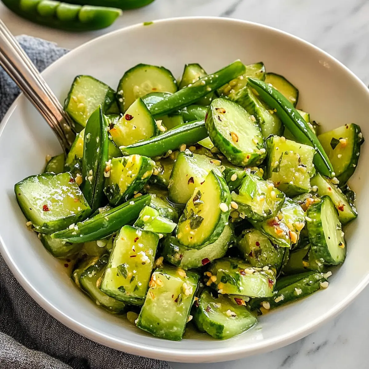 Ich stand in meiner Küche und lauschte dem fröhlichen Plätschern des Wassers, während ich frische Zutaten für meinen Zerdrückte Gurken-Snap-Erbsen-Salat vorbereitete. Dieser Salat ist nicht nur ein Genuss für die Sinne, sondern auch perfekt für den hektischen Alltag. Mit knackigen Gurken und süßen Snap-Erbsen ist er eine erfrischende, gesunde Wahl, die sich in nur 15 Minuten zubereiten lässt. Die Kombination aus Soja, Essig und einem Hauch Chili zaubert jedem Bissen einen intensiven Geschmack auf die Zunge und bringt die Aromen der asiatischen Küche direkt auf den Tisch. Egal, ob als Begleitung zu gegrilltem Fleisch oder einfach als leichter Snack – dieser Salat ist ein echter Hit! Wie praktisch, dass man ihn auch super für spontane Dinner einplanen kann. Bist du bereit, diesen erfrischenden Klassiker auszuprobieren?